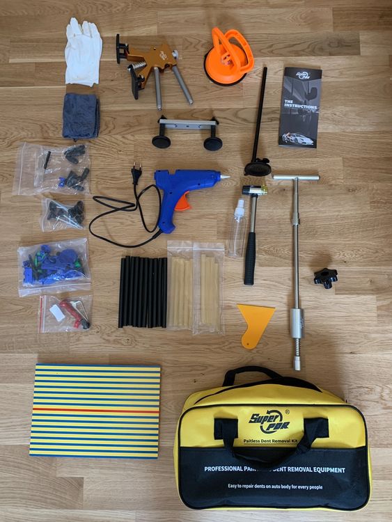 Hey, mit diesem Dellen-Reparaturset kriegst du kleine Beulen im Auto easy wieder raus! Im Set sind 18 verschiedene Ziehlaschen in unterschiedlichen Größen - da ist für jede Delle die passige dabei. Aus robustem Legierungs-Material, hält gut was aus und die Kunststoffscheiben schützen deine Lackierung. Einfach die Stelle mit Alkohol reinigen, Spezialkleber auf die gewählte Lasche, 3-4 Minuten warten und dann vorsichtig ziehen. Die Delle geht langsam raus, ohne dass du lackieren musst! Super nicht nur für Autos, sondern auch für Kühlschränke, Waschmaschinen oder Metallmöbel. Mit nur 11x11cm super kompakt - passt in jeden Kofferraum. Für alle, die kleine Dellen selbst reparieren wollen und keine Lust auf teure Werkstattbesuche haben!