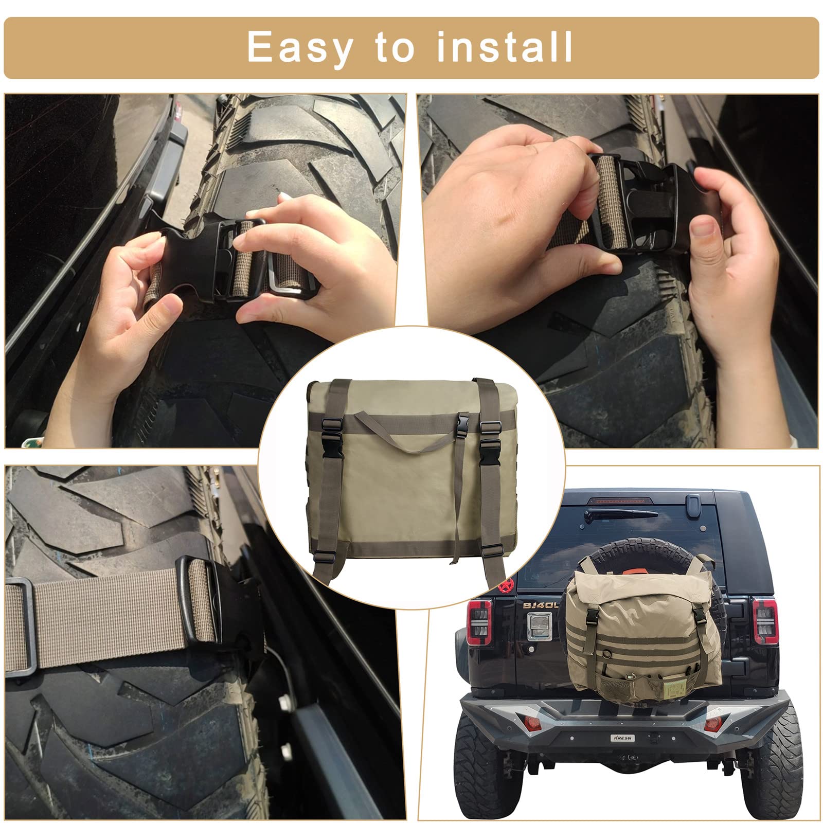 Für alle Outdoor-Fans: Diese Reserverad-Tasche ist einfach praktisch! Maße 58x18x60cm, passt auf fast jedes Reserverad von Jeep, LKW oder SUV. Aus robustem 600D Oxford-Gewebe, richtig stabil und wetterfest. Doppelt genähte Nähte für extra Langlebigkeit. Mit einer Haupttasche mit Kordelzug für größeres Equipment und zwei Netztaschen plus Werkzeugschlaufen. Super als Müllbeutel beim Camping oder für Notfall-Werkzeug. Einfach von oben über das Reserverad stülpen - fertig! Mit robusten Schnallen und Schultergurten für sicheren Halt. Bei 1,025kg leicht genug, aber trotzdem mega stabil. In Khaki oder Schwarz erhältlich. Ob für die nächste Offroad-Tour oder einfach um das Reserverad vor Witterung zu schützen - diese Tasche ist ein Must-Have für jeden Abenteurer!