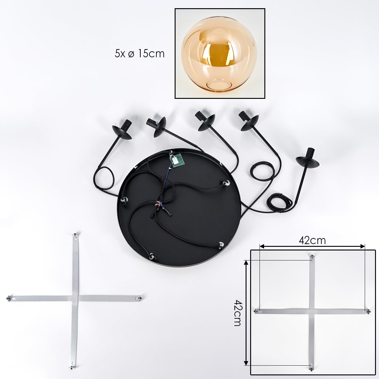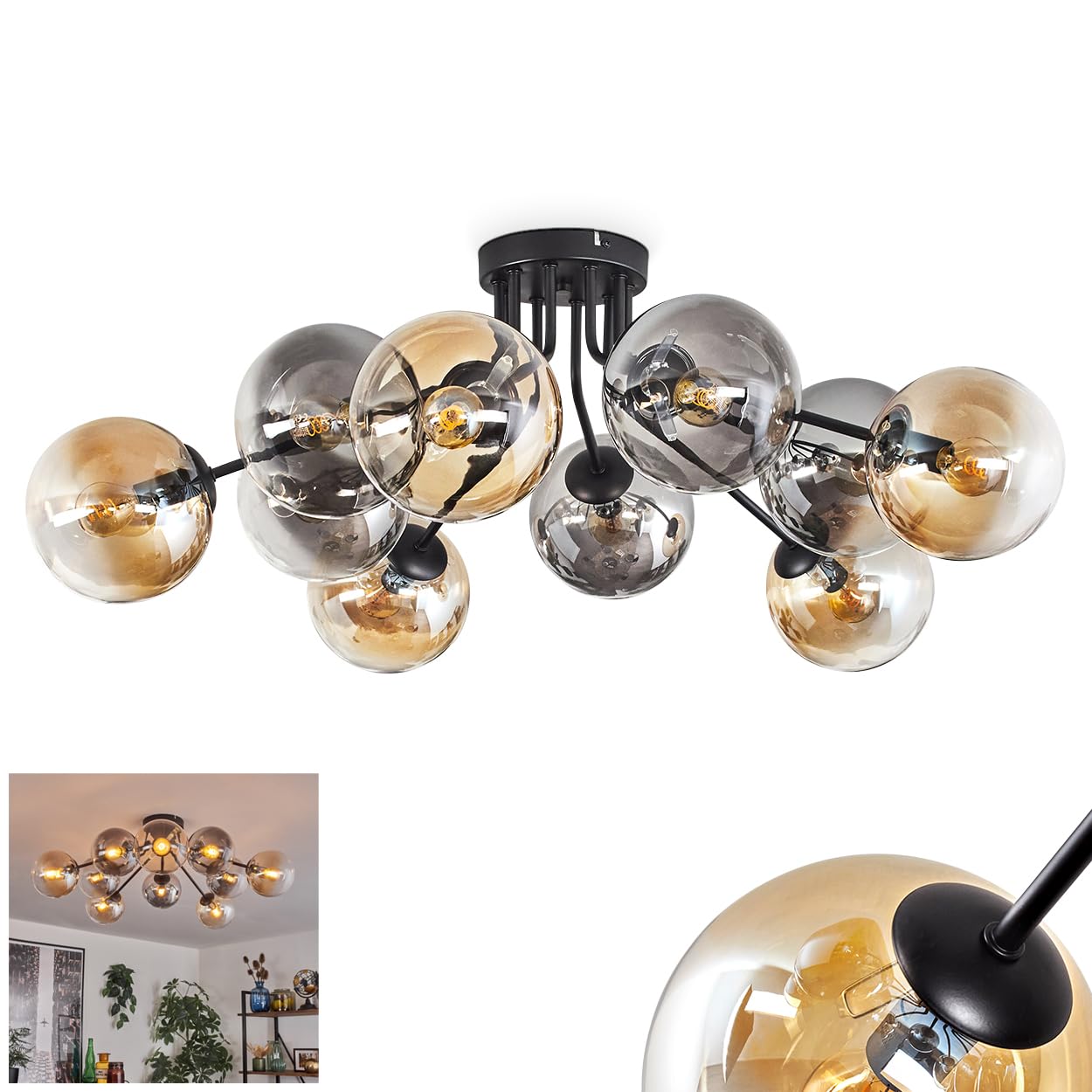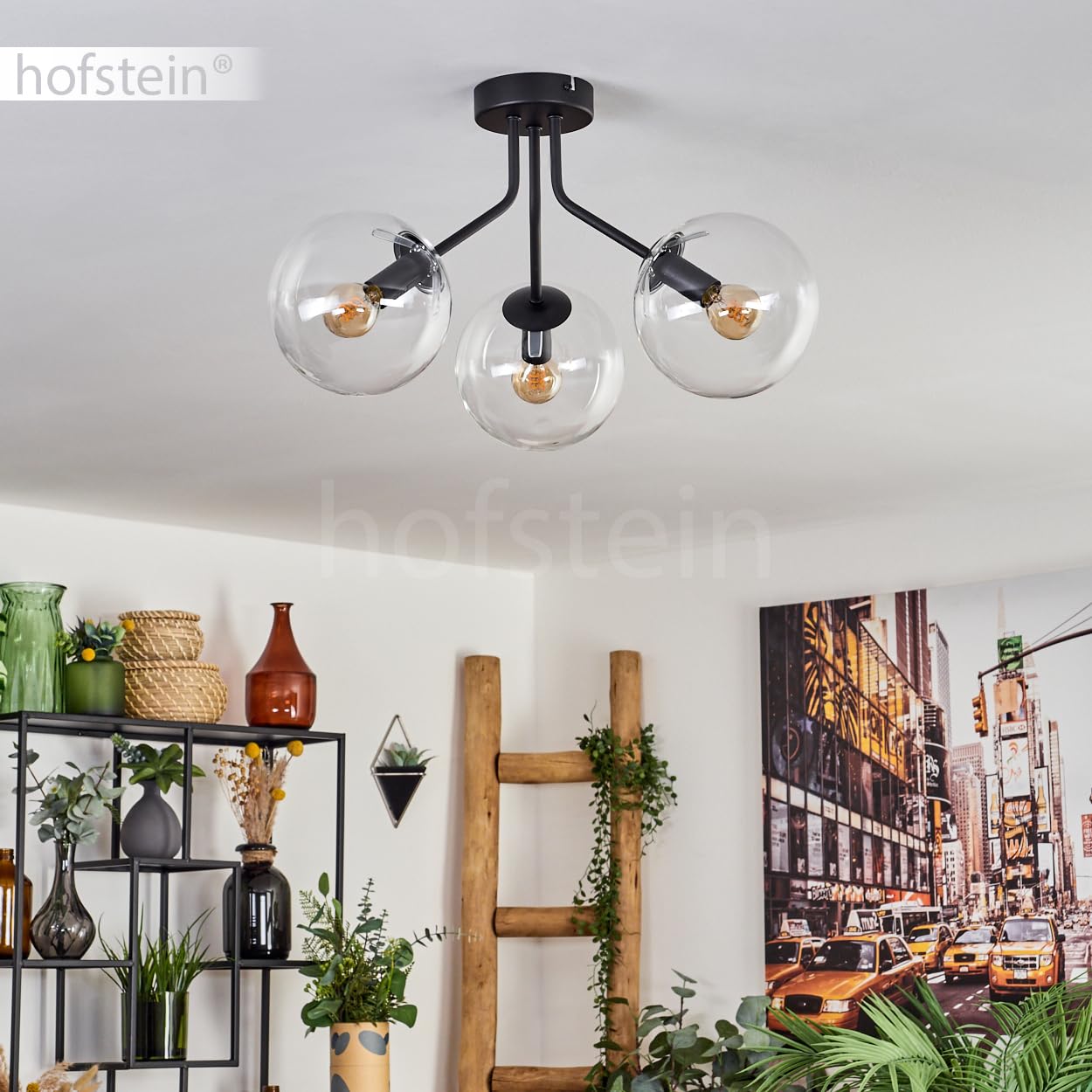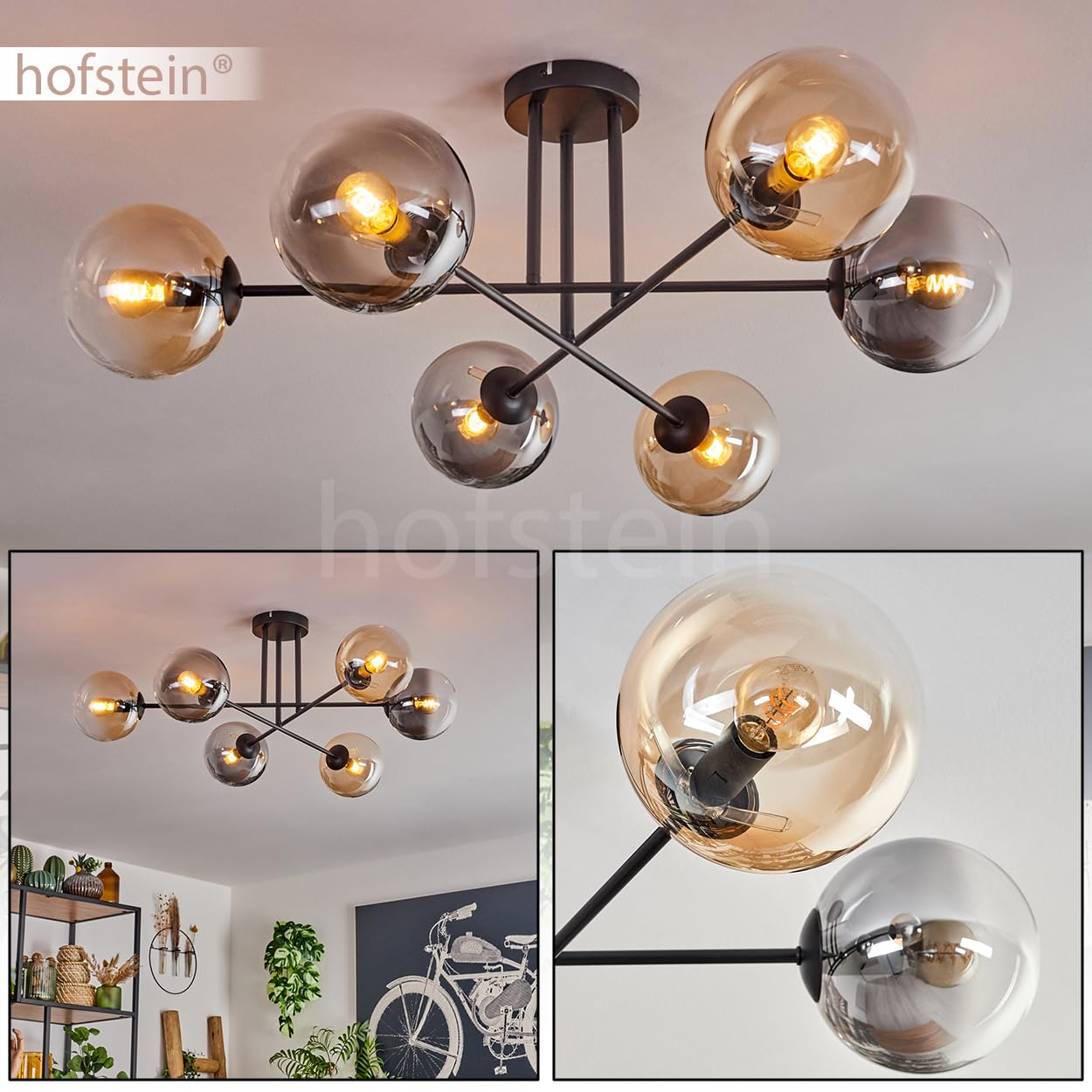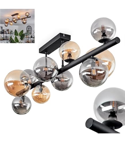 Wow, diese HOFSTEIN Deckenleuchte ist ein absoluter Hingucker! Im Retro-Vintage Design mit 5 flammigen Glaskugeln in Blau, Grün oder Kupfer verleiht sie jedem Raum sofort besonderen Charme. Mit 37cm Breite und 43cm Höhe passt sie perfekt über den Esstisch, ins Wohnzimmer oder Schlafzimmer. Die Metallkonstruktion ist super stabil und die Glas-Schirme sehen einfach edel aus. Für jede der 5 E14 Fassungen brauchst du separate Leuchtmittel (nicht im Lieferumfang). Bis zu 25 Watt pro Fassung sind möglich und mit externem Dimmer (separat erhältlich) regelbar. IP20 Schutz bedeutet: Nur für Innenräume geeignet. Die Montage ist straightforward und das Ergebnis wird dich begeistern. Perfekt für alle, die ihrem Zuhause einen individuellen Touch verpassen wollen!
