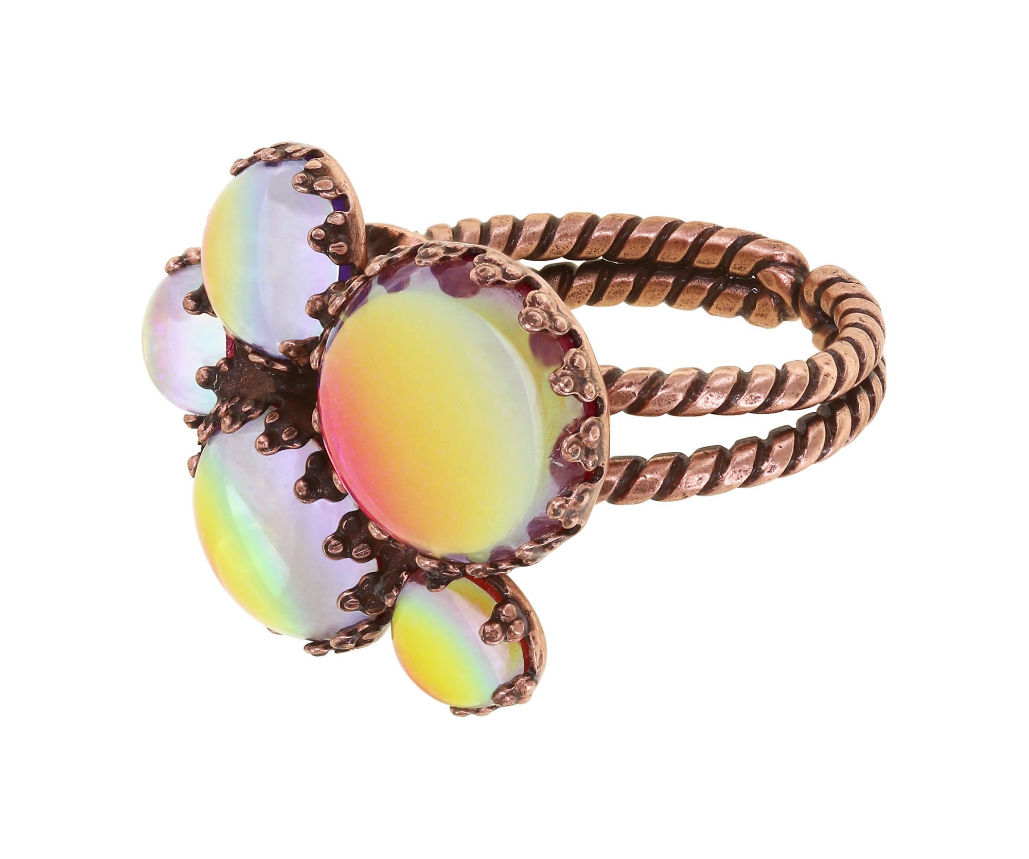 Wow, dieser Ring ist ja ein absoluter Hingucker! Der 'Honey Drops in Space' Ring von Konplott vereint modernes Design mit bezaubernden Farbakzenten. Mit mehreren runden Glasdrop-Steinen in Prinzess-Fassungen, die in changierenden Farben schimmern - einfach magisch! Der Ringkopf misst ca. 30x21 mm und liegt dank der offenen Ringschiene super angenehm an der Hand. Hergestellt aus hochwertigem Messing, das je nach Variante hochglänzend oder matt erhältlich ist. Das Beste: Jedes Stück wird in Deutschland unter höchsten Umweltstandards handgefertigt - kein Massenprodukt, sondern ein echtes Unikat! Nickelgetestet und absolut hautverträglich. Perfekt für alle, die Individualität lieben. Wird in einer hübschen Geschenkbox geliefert - ideal zum Verschenken oder einfach als Treat-yourself-Geschenk!