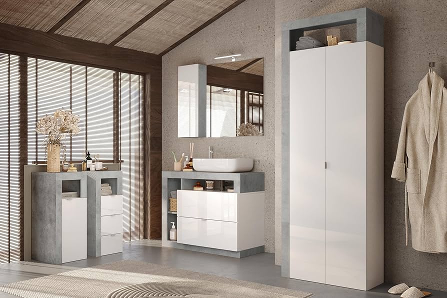 Wow, dieser Waschtisch bringt modernes Flair in dein Bad! Mit 92cm Breite bietet er richtig viel Stauraum in den zwei Schubladen. Das integrierte Keramik-Waschbecken ist nicht nur super schick, sondern auch pflegeleicht - einfach abwischen und fertig. Die Kombi aus weißer Hochglanz-Front und Rahmen in Betonoptik sieht einfach mega aus und passt zu jedem modernen Badezimmer. Aus stabilem, feuchtigkeitsresistentem Holzwerkstoff - hält also ewig. Die Montage ist kein Hexenwerk - kommt in 2 Paketen mit verständlicher Anleitung. Bodenstehend und super stabil, perfekt für größere Badezimmer. Dein Bad wird damit zur Wohlfühloase! Endlich Ordnung und Style in einem. Einfach traumhaft!