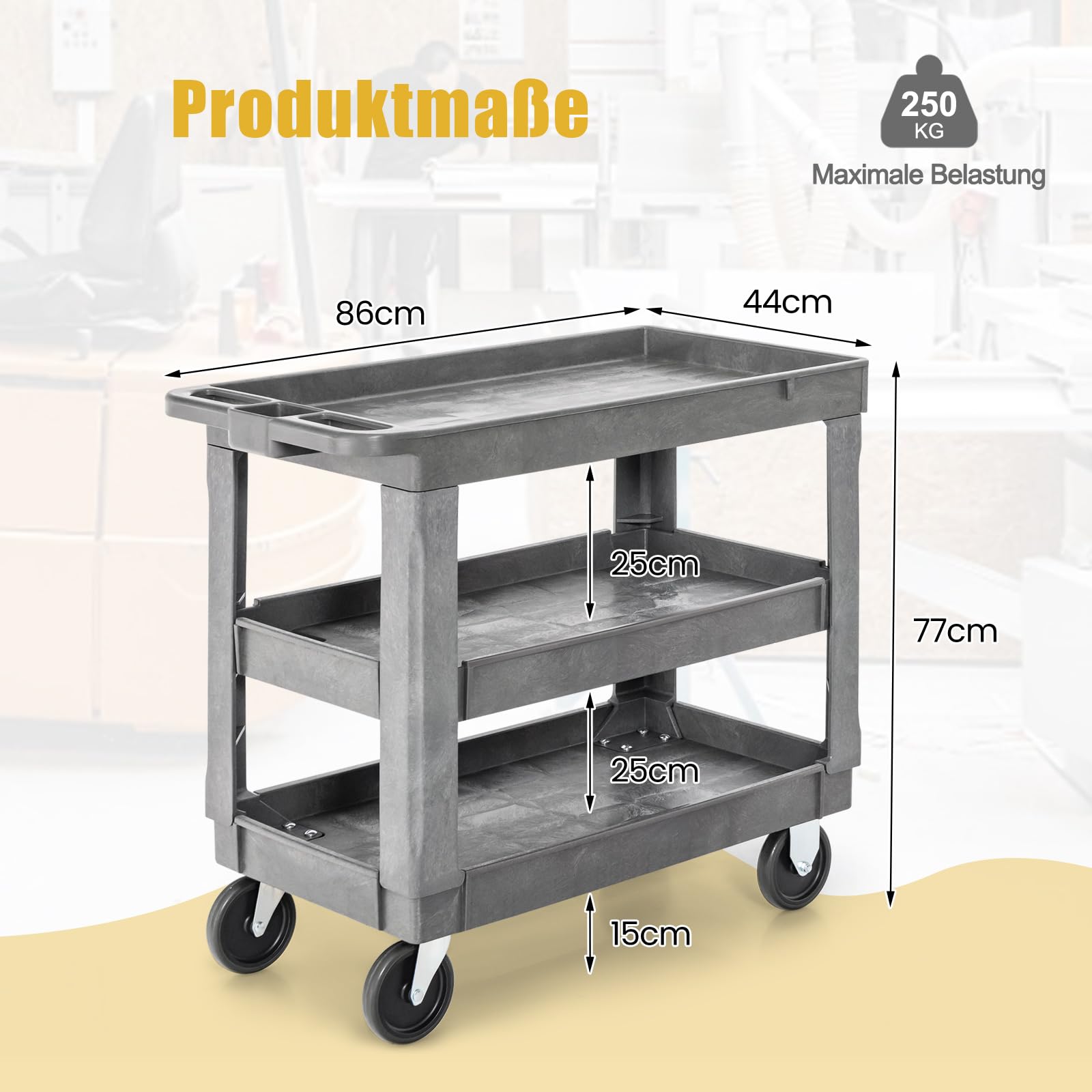 Endlich Ordnung in der Werkstatt! Dieser praktische Werkstattwagen hat 3 Ebenen und trägt bis zu 150kg - da kannst du wirklich alles draufpacken. Mit 77,6x81x35,66 cm bietet er genug Platz für alle deine Werkzeuge. \\n\\nDie 4 Rollen (2 mit Bremsen) machen ihn super mobil. Einfach schieben und an der gewünschten Position arretieren. Mit abnehmbaren Haken und Seitenhaltern für Schraubendreher - alles hat seinen Platz! \\n\\nDie Aufbewahrungsbox mit Schloss schützt wertvolle Teile. Aus Stahl gefertigt und mit Backfarbe lackiert - rostbeständig und langlebig. Perfekt für Garage, Auto-Werkstatt oder Hobbyraum. Einfach aufbauen und sofort nutzen!