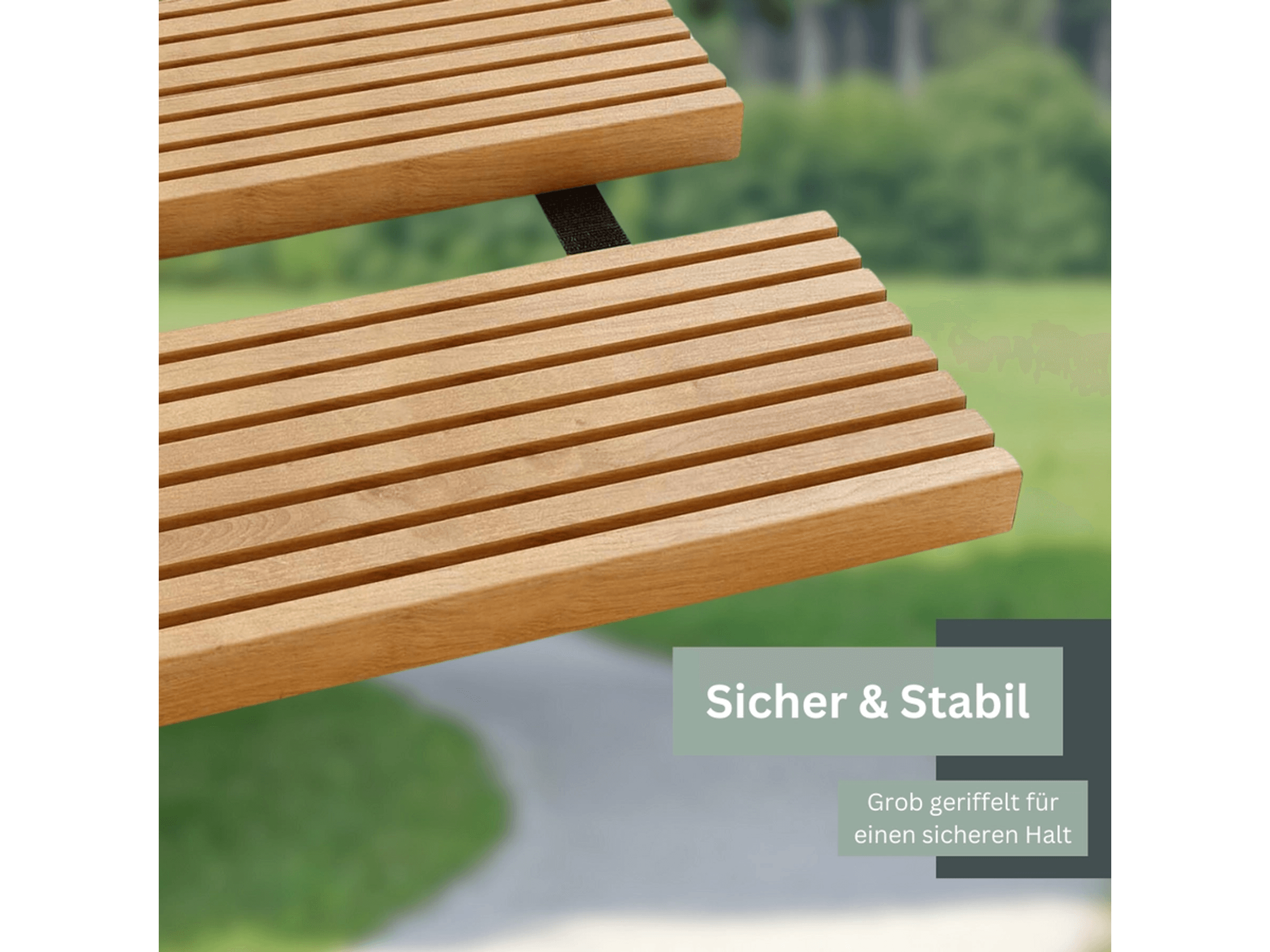 Dein Garten bekommt rustikale Wege! Dieser Rollweg aus heimischer Lärche besteht aus 14 Holztritten (26x12cm, 2cm stark), die auf elastischem Band befestigt sind. Einfach ausrollen - fertig ist der Gartenweg! Gesamtlänge ca. 2,5m. Lärchenholz ist extrem witterungsbeständig und langlebig - auch ohne Behandlung. Die Dielen sind einseitig grob, andererseits fein geriffelt für bessere Rutschfestigkeit. Perfekt für Beete, Terrasse oder als temporäre Wege. 'Gartenwelt Riegelsberger' - Qualität made in Germany!