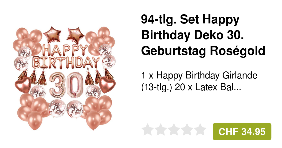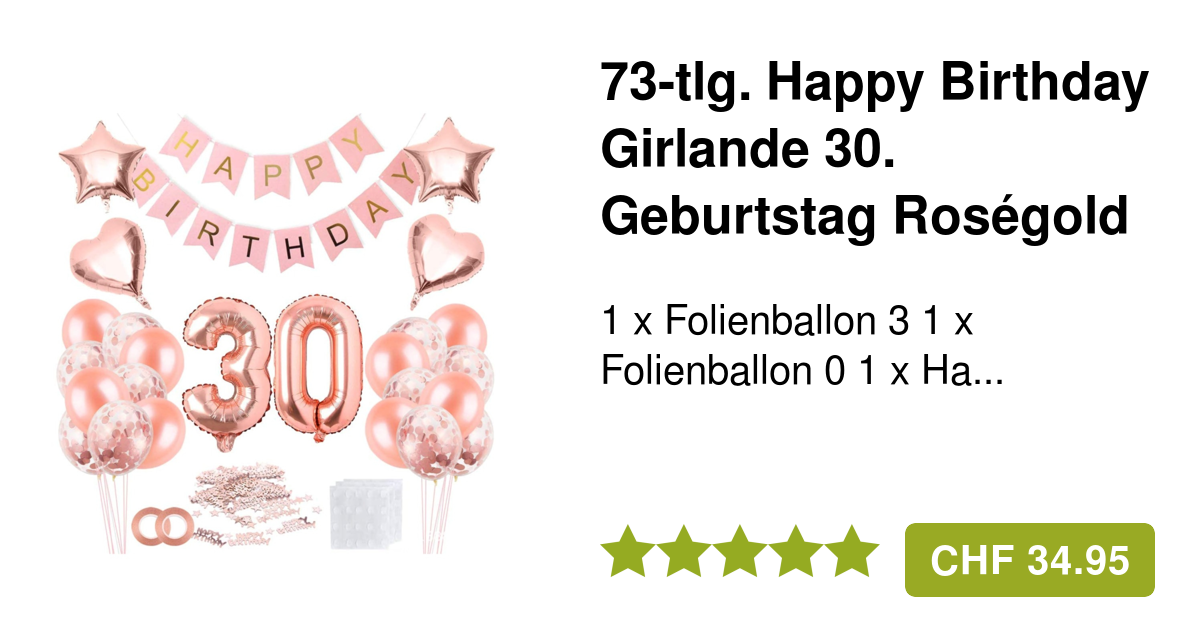 Perfekte Deko für den 30. Geburtstag! Dieses komplett Set in trendigem Rosegold lässt keine Wünsche offen. Enthalten sind zwei riesige 40-Zoll-Ballons (ca. 100cm), die sofort ins Auge stechen. Dazu eine 'Happy Birthday'-Girlande und eine elegante Wimpelkette mit der Zahl 30. Alles in schimmerndem Rosegold - modern, stylisch und absolut fotogen! Einfache Montage: Die Buchstaben und Zahlen der Girlande lassen sich einfach mit den integrierten Nadeln und der Schnur zusammenfügen. Kein Kleben, kein kompliziertes Aufhängen. Aus hochwertigen Materialien gefertigt - sicher und langlebig in der Anwendung. Die Ballons sind wiederverwendbar, die Papier-Girlande einseitig bedruckt. Perfekt für die Geburtstagsparty, Jubiläumsfeier oder einfach um dem Geburtstagskind eine besondere Freude zu machen. Schaffe eine unvergessliche Atmosphäre mit dieser professionellen Deko. Alles in einem Set - kein separates Suchen mehr nach passenden Dekorationen. Mach die Party deines Lebens unvergesslich mit dieser traumhaften Rosegold-Deko!