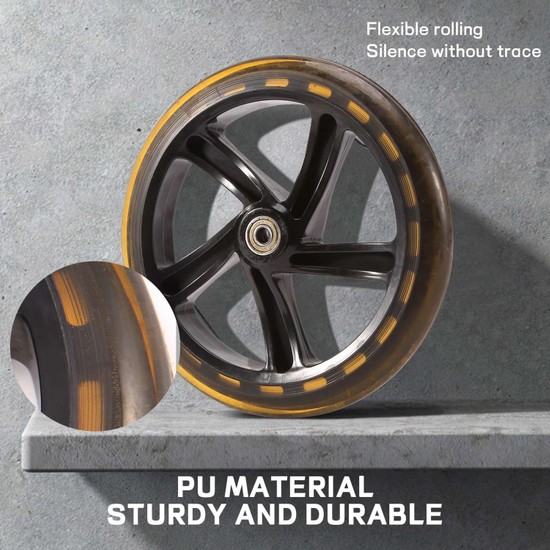Jedes Rad hat einen Durchmesser von 200 mm und eine Breite von 40 mm - eine gängige Größe für viele Tretroller-Modelle. Die PU-Räder sind elastisch und leise, sorgen also für eine angenehme Fahrt ohne viel Geräusche.