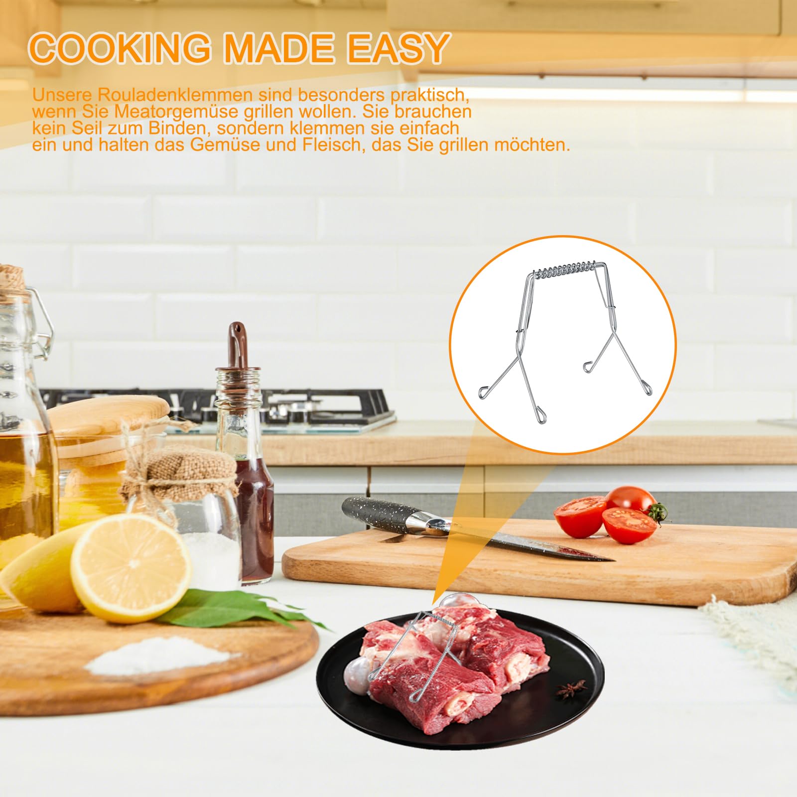 Schluss mit gefährlichen Rouladennadeln! Diese 10 Edelstahl-Klammern sind die perfekte Alternative. Aus hochwertigem 304 Edelstahl, rostfrei und spülmaschinenfest. Größe: 8,5x5,5cm - ideal für jede Rouladengröße. Einfach die Feder aufziehen, um die Roulade legen und schon hält alles perfekt zusammen. Kein Auslaufen mehr, kein Verrutschen! Super einfach zu reinigen - die glatte Oberfläche nimmt keine Essensreste an. Wiederverwendbar und absolut sicher in der Handhabung. Macht die Rouladen-Zubereitung zum Kinderspiel. Perfekt für Kohlrouladen, Fleischrouladen und mehr!