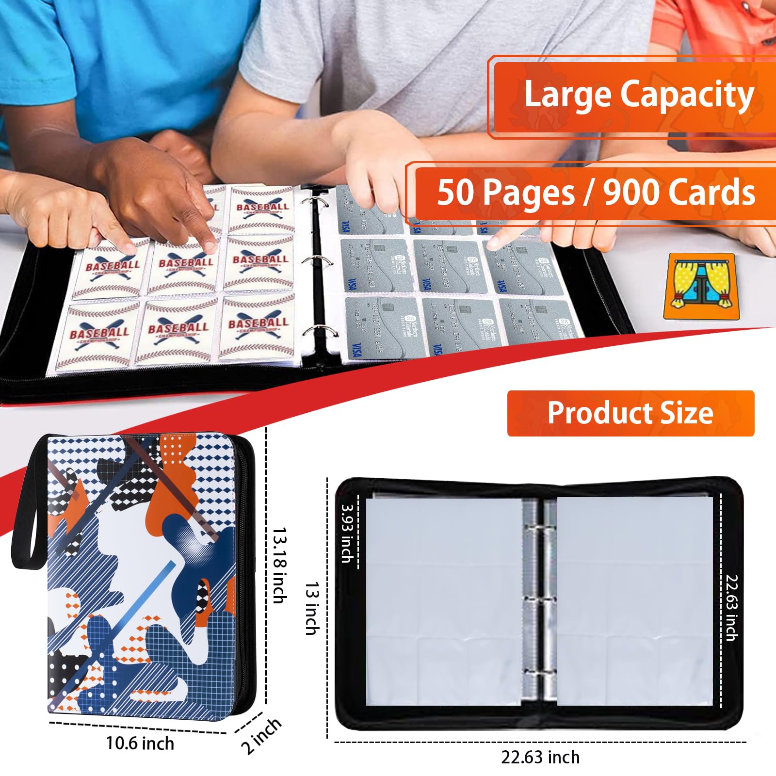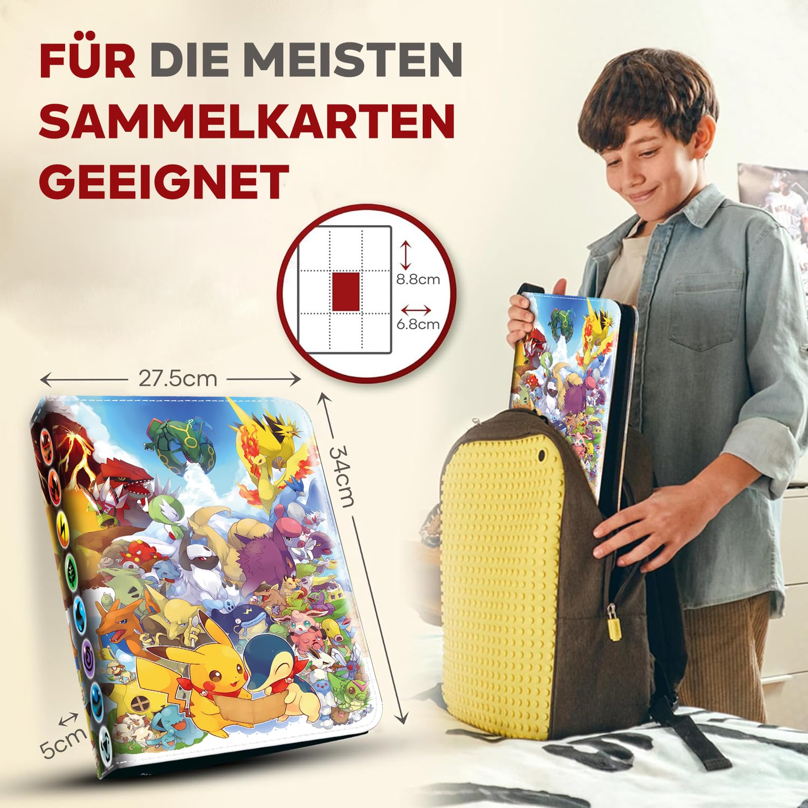 Pokémon, YuGiOh, Magic - wenn du ein leidenschaftlicher Karten-Sammler bist, kennst du das Problem: Die Karten liegen überall rum, werden knitterig oder gehen verloren. Dieses Sammelalbum mit 50 Seiten und Platz für satte 900 Karten bringt Ordnung in deine Sammlung!\\n\\nDas wasserdichte PU-Leder schützt deine wertvollen Karten vor Feuchtigkeit, Kratzern und Verformungen. Der Reißverschluss sorgt dafür, dass nichts herausfällt - selbst wenn du das Album mal fallen lässt. Und das Coole: Du kannst Seiten hinzufügen oder entfernen, je nachdem wie sich deine Sammlung entwickelt.\\n\\nEgal ob Sammelkarten, Spielkarten, Zauberkarten oder sogar kleine Polaroid-Bilder - hier findet alles Platz. Die transparenten Taschen zeigen deine Schätze in voller Pracht, ohne dass du sie berühren musst.\\n\\nFür Kinder ist das Album ein super Geschenk, das die Sammelleidenschaft fördert und Organisationstalent entwickelt. Aber auch erwachsene Sammler werden es lieben! Endlich alles an einem Ort, übersichtlich und sicher verwahrt. Deine wertvollsten Karten verdienen diesen Schutz!