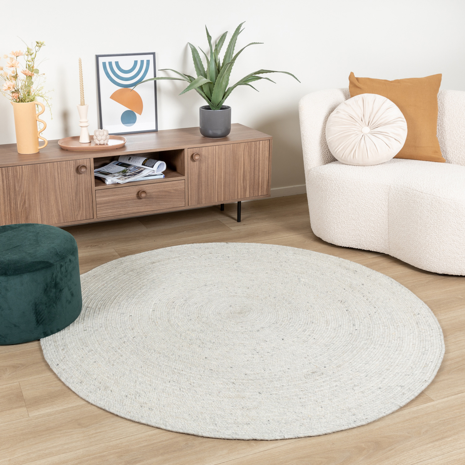 Dieser FRAAI Wollteppich in grau-melierter Farbe bringt skandinavisches Flair in dein Zuhause! Aus 100% reiner Wolle handgewebt, ist er 7mm dick und super strapazierfähig. Das coole Feature: Er ist beidseitig verwendbar - kein Oben oder Unten! Die runde Form bricht elegante die geraden Linien im Raum auf und schafft eine gemütliche Atmosphäre. Wolle hat natürliche selbstreinigende Eigenschaften - Krümel und kleine Flecken haben kaum eine Chance. Perfekt für Wohnzimmer, Schlafzimmer, Essbereich oder Büro. Die weiche Oberfläche fühlt sich super an den Füßen an und sorgt für wohlige Wärme. Ein echter Hingucker, der jedem Raum das gewisse Etwas verleiht. Qualität, die man sieht und fühlt!