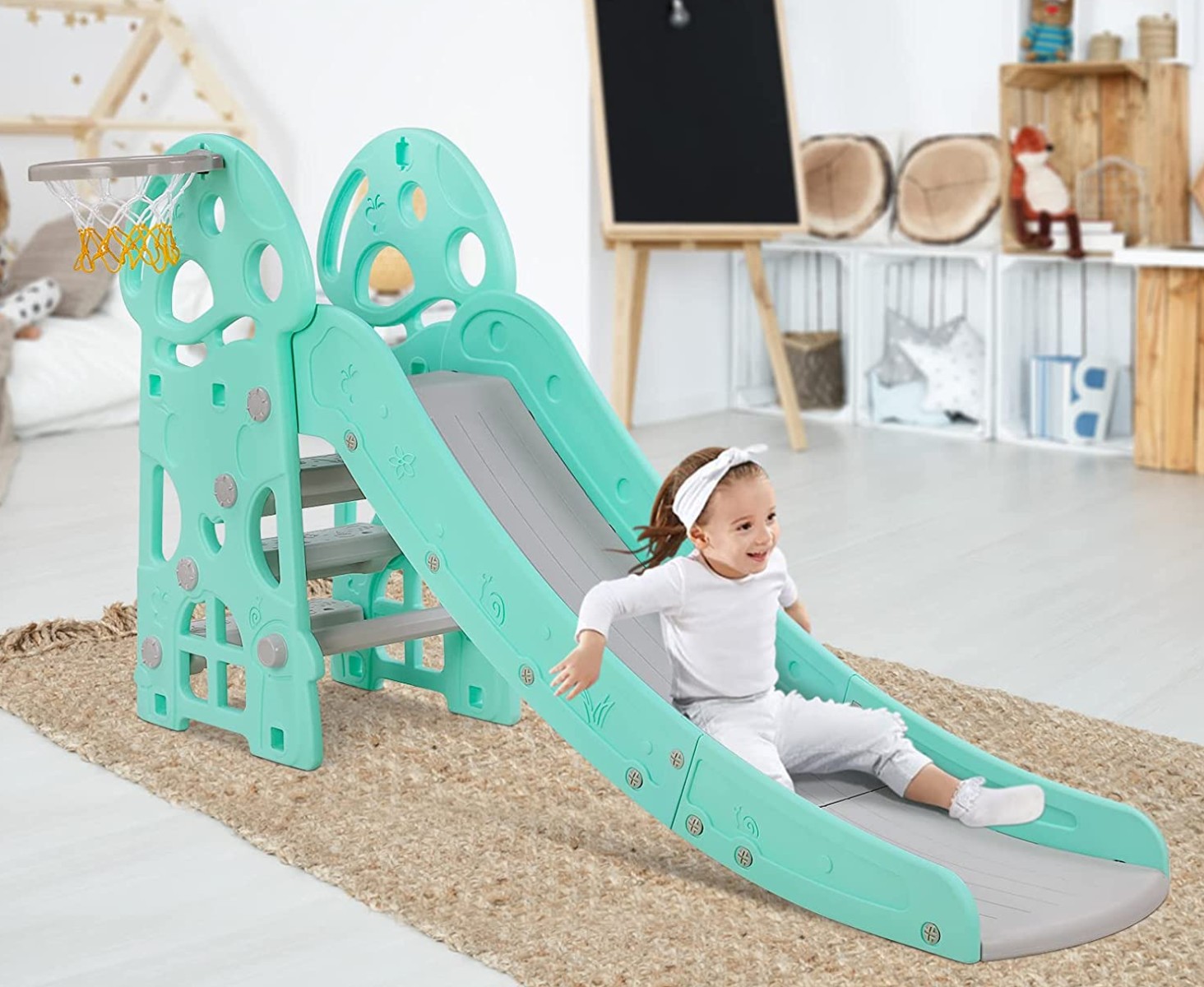 Spielspaß pur für die Kleinen! Diese süße Dinosaurier-Rutsche in Rosa bietet alles was Kinderherzen höher schlagen lässt: Eine stabile Rutsche, eine Treppe mit rutschfesten Tritten UND einen Basketballkorb! Förder spielerisch die motorischen Fähigkeiten deines Kindes - Klettern, Rutschen und Werfen trainieren Balance und Koordination. Besonders praktisch: Die Rutsche ist faltbar und kann ohne Werkzeug aufgebaut werden. Maximale Tragfähigkeit 50 kg - also auch für etwas größere Kinder geeignet. Das dreieckige Stützsystem garantiert absolute Stabilität, die hohen Handläufe bieten Sicherheit beim Klettern. Perfekt für drinnen und draußen, platzsparend zu verstauen. Mit abgerundeten Kanten und weicher Polsterung für maximale Sicherheit. Dein Kind wird stundenlangen Spielspaß haben - und du ein ruhiges Gewissen!