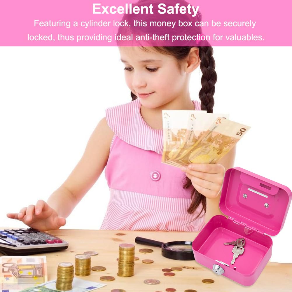Hey, diese niedliche rosa Geldkassette ist einfach perfekt für alle, die ihr Geld oder kleine Wertgegenstände sicher aufbewahren wollen! Aus robustem Stahl gefertigt und mit einem praktischen Zylinderschloss ausgestattet, hält sie neugierige Blicke und kleine Diebe zuverlässig fern. Mit den Maßen 11,5 x 8,5 x 5,3 cm passt sie super in jedes Regal oder auf den Schreibtisch. Der integrierte Münzschlitz oben macht das Sparen zum Kinderspiel, und der vernickelte Stahlgriff erleichtert den Transport. Perfekt für zu Hause, Büros oder Schulen - und mit zwei mitgelieferten Schlüsseln hast du immer Ersatz parat. Ein tolles Geschenk für Kinder, Jugendliche oder einfach für dich selbst, um endlich Ordnung in die Finanzen zu bringen!