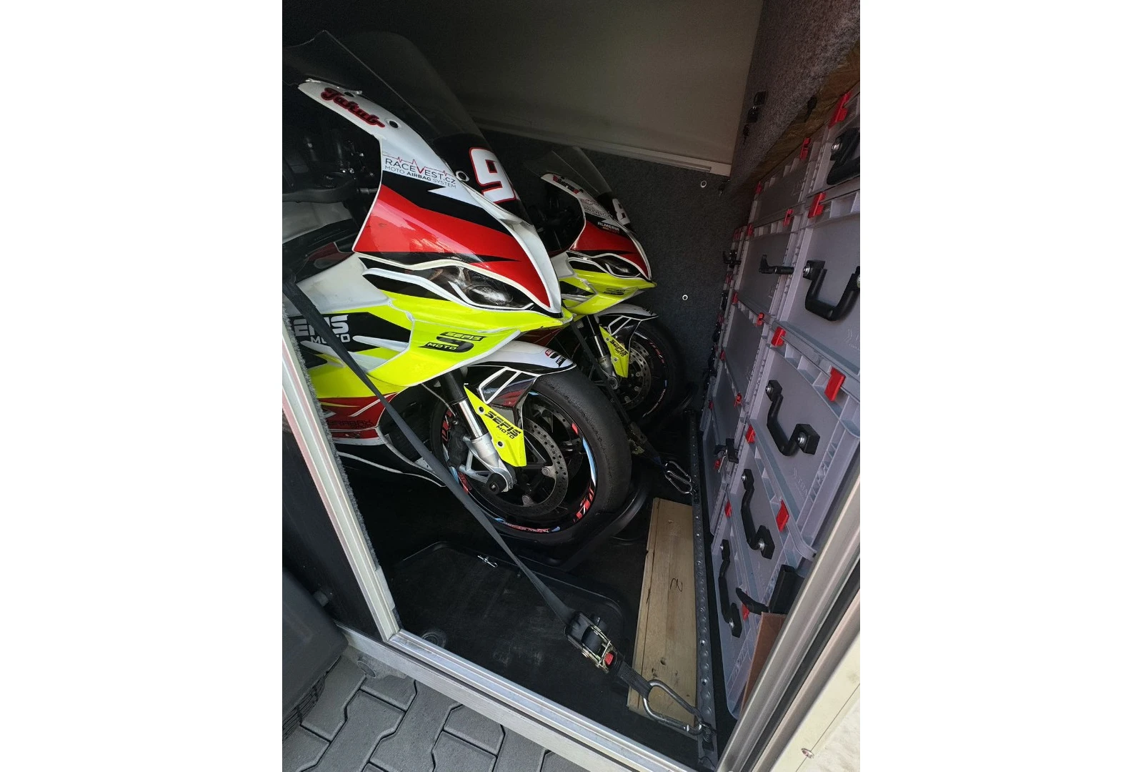 Aus massivem Stahl mit 30mm Profilen - ultra-stabil. Sicherungsstift verhindert unbeabsichtigtes Lösen, Gummiadapter schützen vor Kratzern. 10mm Löcher zur Bodenverankerung in Transporter oder Garage.