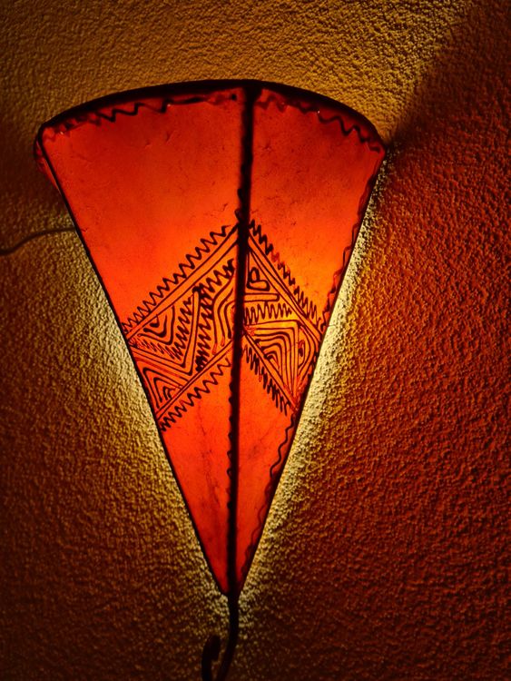 Diese wunderschöne Henna-Lederlampe aus Rajasthan verbreitet magisches Licht! Handgefertigt aus Ziegenleder, mit traditionellen Henna-Motiven bemalt. Intensive orange Farbe schafft eine warme, gemütliche Atmosphäre. Maße: 48x38x20 cm. Ein absoluter Hingucker für Wohnzimmer, Schlafzimmer oder besondere Räume. Wichtig: Nur trocken reinigen, nicht feucht abwischen. Verwandele dein Zuhause in eine orientalische Oase!