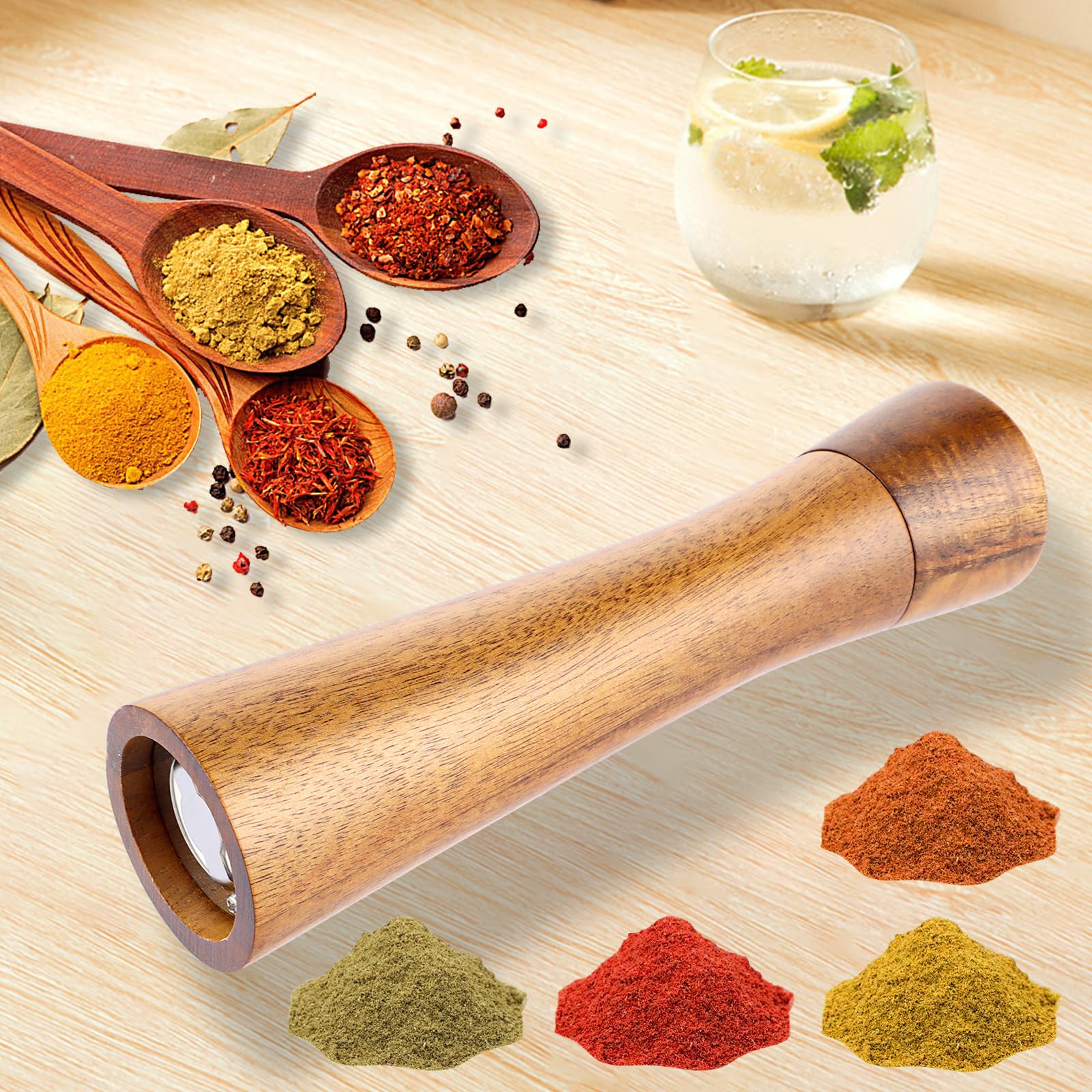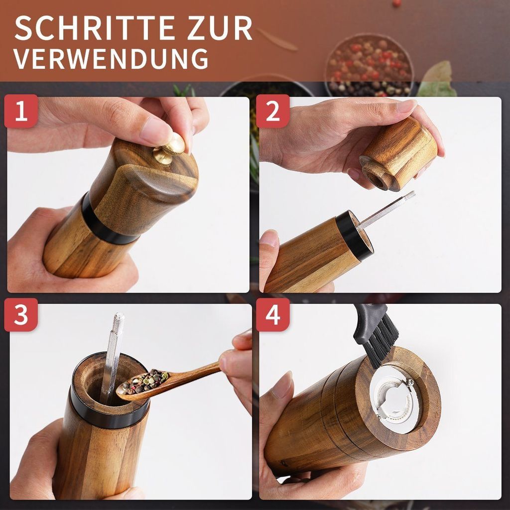 Wow, was für ein schönes Set! Diese beiden Salz- und Pfeffermühlen aus Akazienholz sehen nicht nur edel aus, sondern machen auch noch einen super Job. Mit 21cm Höhe passen sie perfekt in jede Küche oder auf den Esstisch. Das stufenlos einstellbare Keramikmahlwerk ist absolut langlebig und rostfrei - mahlt sowohl Salz als auch Pfeffer gleichmäßig fein oder grob, ganz wie du es magst. Frisch gemahlene Gewürze einfach viel intensiver - das weiß jeder Hobbykoch! Die natürliche Holzmaserung des Akazienholzes gibt jeder Mühle ihren eigenen Charakter. Mit der beiliegenden Reinigungsbürste lassen sich Rückstände ganz leicht entfernen. Perfekt für alle, die Wert auf gutes Essen und schönes Design legen. Ob als Geschenk für Kochbegeisterte oder für die eigene Küche - dieses Set begeistert einfach jeden!
