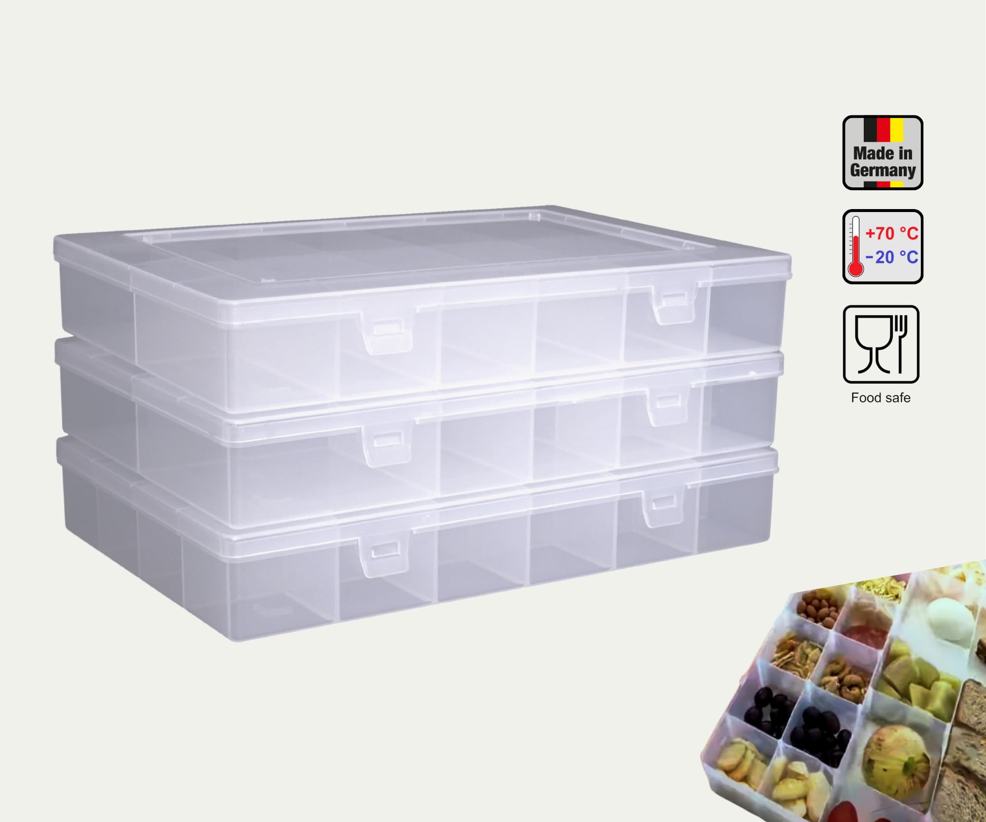 Riesen Sortierkasten mit 48 verstellbaren Fächern! Maße: 36,5x27x4,5cm - perfekt für Schrauben, Nägel, Muttern, Perlen, Nähzubehör und mehr. Aus stabilem PP-Kunststoff, lebensmittelecht und BPA-frei. Die Fächer lassen sich verschieben oder entfernen für größere Gegenstände. Transparenter Deckel - du siehst sofort was wo ist. Temperaturbeständig von -20°C bis +70°C. Super stabil, wiegt stolze 603g! Viel schwerer und robuster als billige Modelle. Perfekt für Werkstatt, Hobbykeller oder Bastelzimmer. Endlich Ordnung im Chaos! Ein Must-Have für jeden Ordnungsliebhaber.