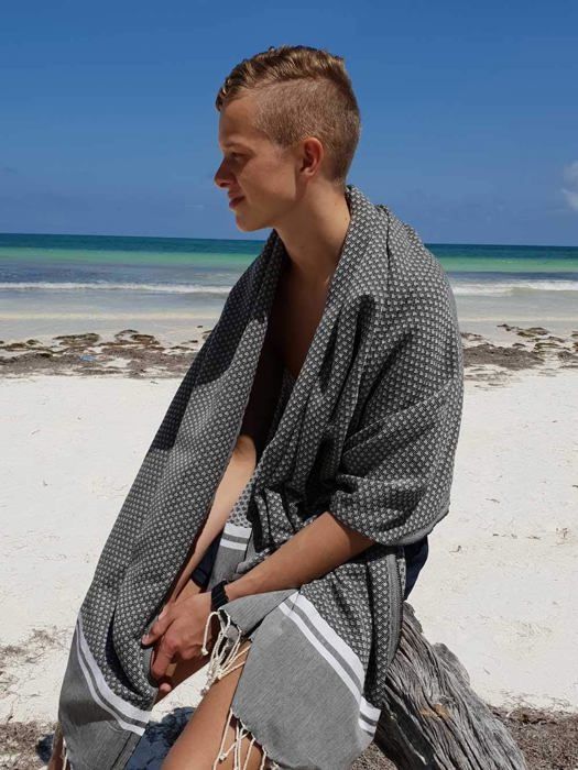 Entdeckt das Wunder der Hamamtücher! Dieses wunderschöne Fouta-Tuch aus 100% Baumwolle ist der absolute Allrounder für Strand, Sauna und Zuhause. Mit den Maßen 100x190 cm (ohne die langen Fransen) ist es groß genug zum Einhüllen, aber mit nur 380 Gramm super leicht. Das Waffelmuster saugt Wasser wie verrückt auf, trocknet aber blitzschnell - und Sand bleibt einfach nicht hängen! Hergestellt in Tunesien unter fairen Bedingungen, zertifiziert mit OEKO-TEX Standard 100. Perfekt als Strandtuch, Saunatum, Yoga-Decke, Pareo oder sogar als leichte Bettdecke im Sommer. Maschinenwaschbar bei 30°C (bitte keinen Trockner). Die intensive Meeresgrün-Farbe bleibt auch nach vielen Waschgängen brillant. Ein Stück Urlaubsfeeling für jeden Tag - und dazu noch sozial und ökologisch verantwortlich produziert!