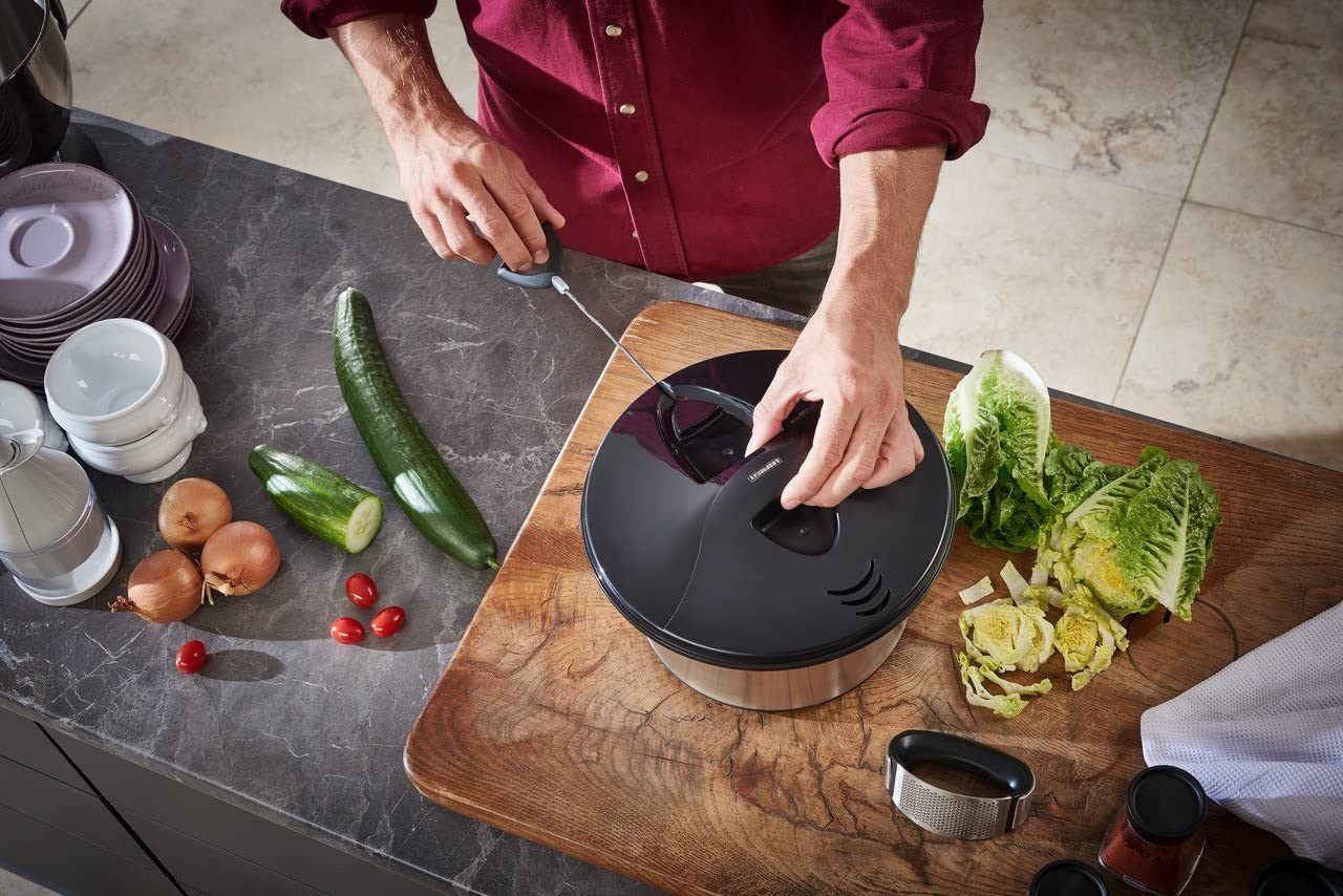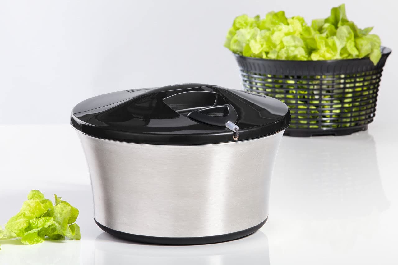 Perfekte Salatschleuder für frische, trockene Salate! Mit 6 Litern Fassungsvermögen ideal für Familien oder Partys. Aus lebensmittelechtem Edelstahl und PP, robust und langlebig. Der praktische Deckel hat ein integriertes Abflusssystem - du kannst waschen und schleudern, ohne den Deckel abnehmen zu müssen. Rutschfester Boden sorgt für Stabilität beim Schleudern. Einfach zu reinigen, alle Teile lassen sich auseinandernehmen. Macht aus nassem Salat im Handumdrehen knackig-frischen Genuss!