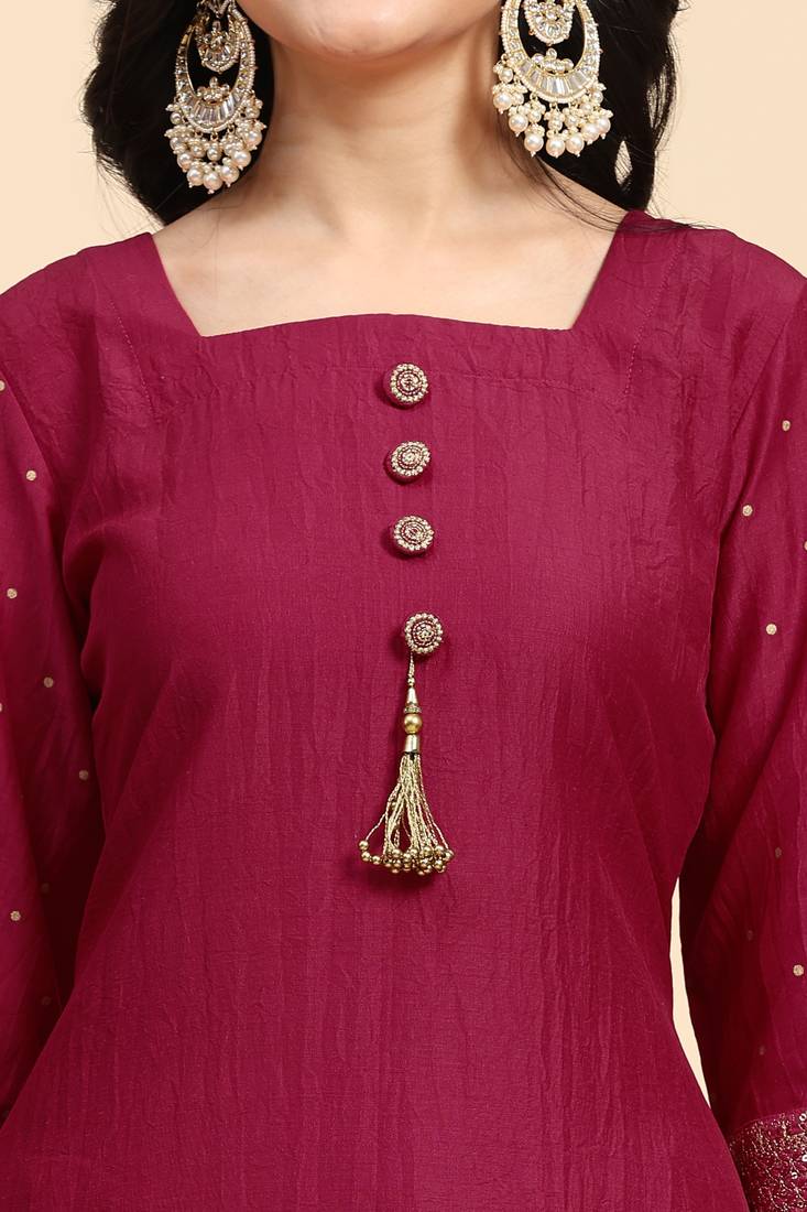 Boah, dieses Salwar Anzug Set ist ja der absolute Hingucker! Aus weichem Samt gefertigt und in einem tollen Rosaton kommt es daher - perfekt für besondere Anlässe. Das Set besteht aus drei Teilen: einer wunderschön verarbeiteten Kurta mit 3/4-Ärmeln und Rundhalsausschnitt, einer passenden Salwar (das sind diese typischen weiten Hosen) und einem luftigen Dupatta-Tuch aus Organza. Die ganze Kombi ist mit aufwendiger Sequenz-Stickerei und Schnittarbeit verziert, die richtig edel aussieht. Die Maße sind: Kurta 109,2 cm, Ärmel 43,2 cm, Salwar 96,5 cm und der Dupatta ist ganze 2,25 Meter lang - damit kannst du dich richtig elegant drapieren. Unser Model (1,52 m groß) trägt Größe S, also achte bitte auf die Größenangaben. Ob Hochzeit, Festivals oder Familienfeiern - in diesem Outfit wirst du definitiv alle Blicke auf dich ziehen! Das Beste: Es kommt fertig genäht an, du musst also nichts mehr anpassen lassen. Einfach auspacken, anziehen und strahlen!