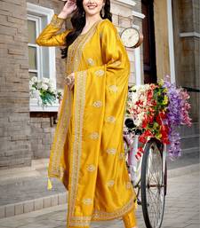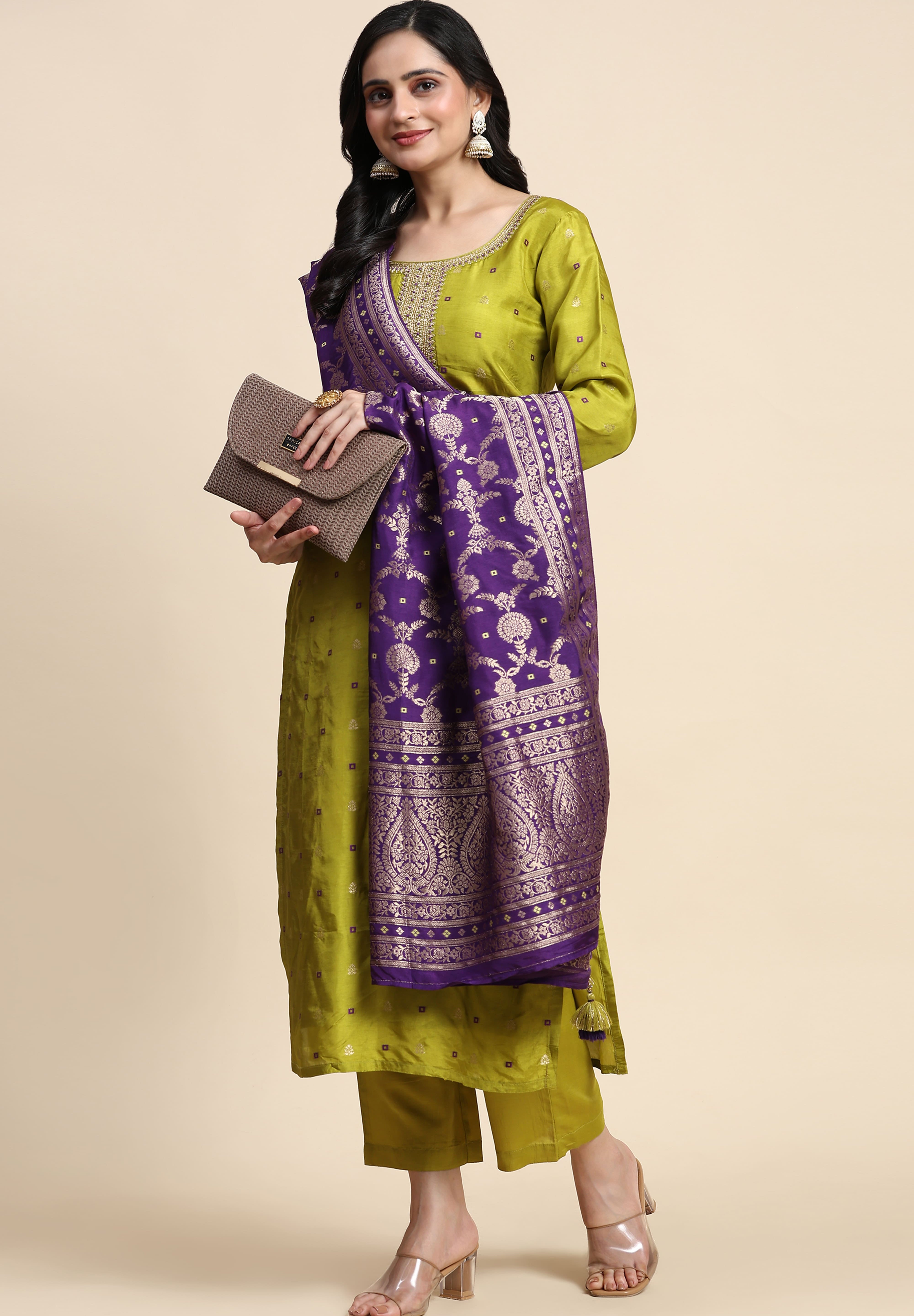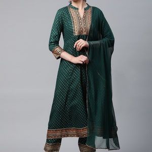 Wow, dieses Salwar Anzug Set von TRENDMALLS ist einfach traumhaft schön! In einem eleganten Grün gefertigt, besteht der Kurta aus weichem Samt mit wunderschöner Sequenz-Stickerei. Der Salwar (Hose) ist ebenfalls aus Samt, während der Dupatta (Schal) aus Jacquard-Seide mit Quastenverzierung gefertigt ist. Der Herzausschnitt und die vollen Ärmel verleihen dem Outfit eine besondere Note. Maße: Kurta 109,2 cm lang, Ärmel 43,2 cm, Salwar 96,5 cm, Dupatta 2,25 m lang. Perfekt für Hochzeiten, Festivals, Partys oder besondere Anlässe. Das Model (1,52 m groß) trägt Größe S - bitte die Größe entsprechend wählen. Komplett-Set inklusive Kurta, Salwar und Dupatta - sofort tragefertig! Siehst du darin einfach umwerfend aus und fühlst dich wie eine Prinzessin. Kombiniere es mit passendem Schmuck und du bist der Star jeder Feier! Einfach anziehen und bewundern lassen - dieses traditionelle Outfit begeistert garantiert!
