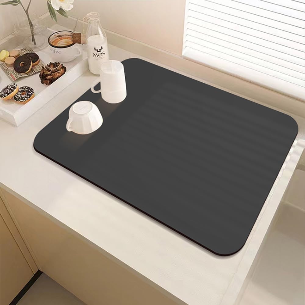 Schluss mit nassen Arbeitsplatten! Diese super saugfähige Abtropfmatte aus Kieselalgenschlamm saugt Wasser blitzschnell auf und hält deine Küchenarbeitsplatte trocken und sauber.