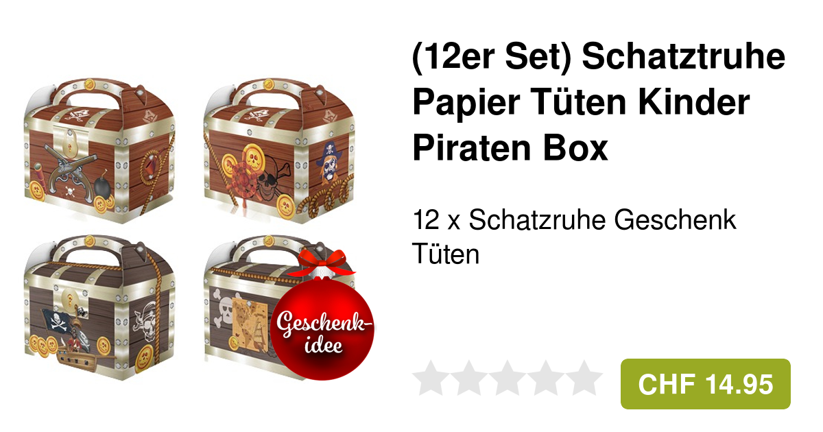Ahoy, Piraten-Kapitäne! Planst du eine coole Piraten-Party? Dieses Set mit 12 Schatztruhen aus Pappe ist genau das Richtige! Super einfach zusammenzubauen - kein Kleber nötig, einfach knicken und fertig. Mit authentischen Piraten-Motiven wie Totenköpfen und Schwertern. Aus umweltfreundlichem Karton, robust und wiederverwendbar. Perfekt für die Schatzsuche, als Süßigkeiten-Behälter oder Gastgeschenk-Verpackung. Mach deine Kinderparty zum unvergesslichen Abenteuer! Die Truhen sehen auf dem Geburtstagstisch einfach klasse aus und begeistern kleine Piraten. Einfach mit Süßigkeiten füllen und verstecken - die Schatzsuche kann beginnen! Praktisch, günstig und voller Piraten-Flair.