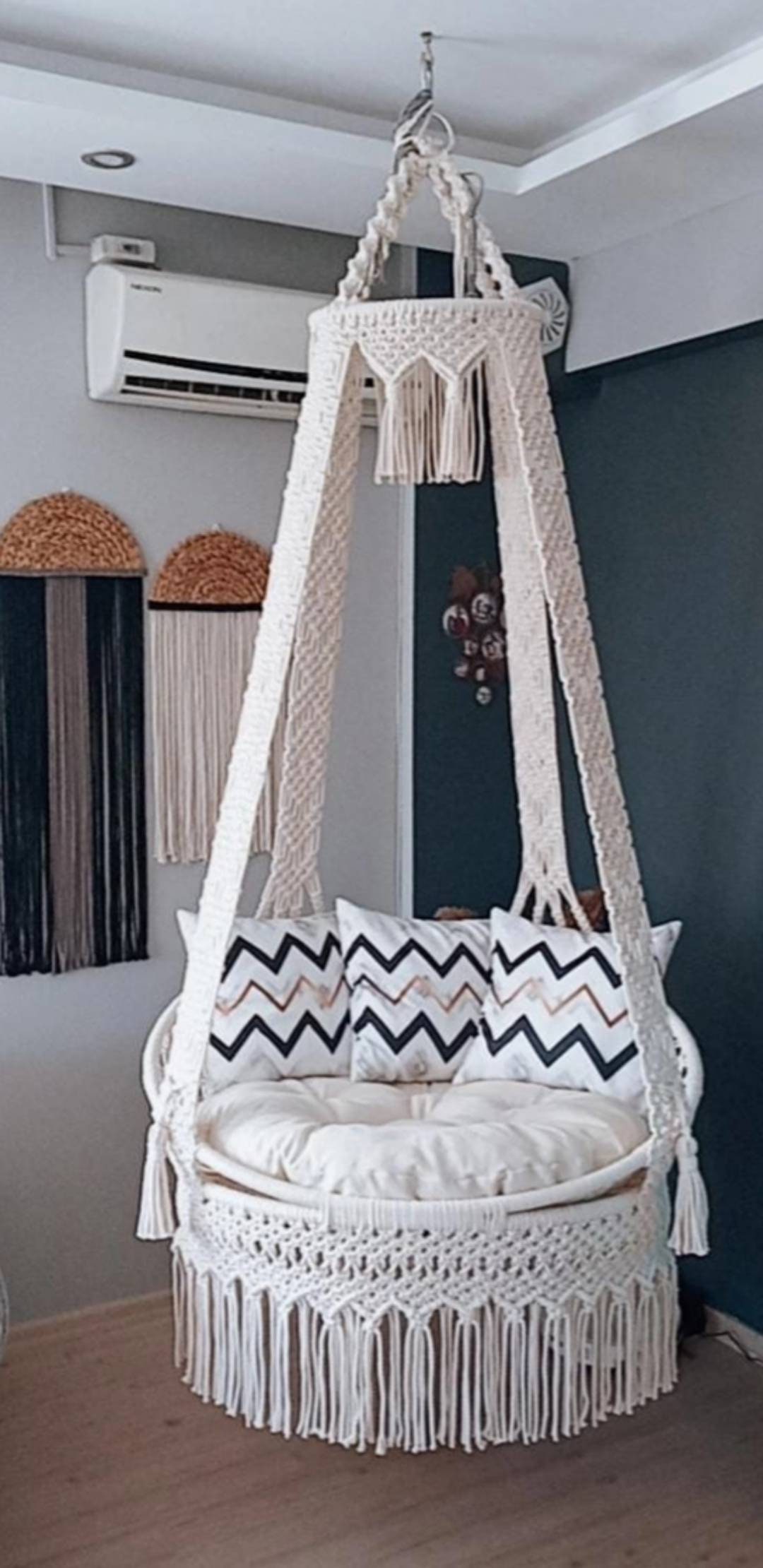 Träumst du von einer gemütlichen Leseecke oder einer entspannenden Terrasse? Dieser handgefertigte Makramee-Schaukelstuhl verwandelt jeden Raum in eine Wohlfühloase! 🌿