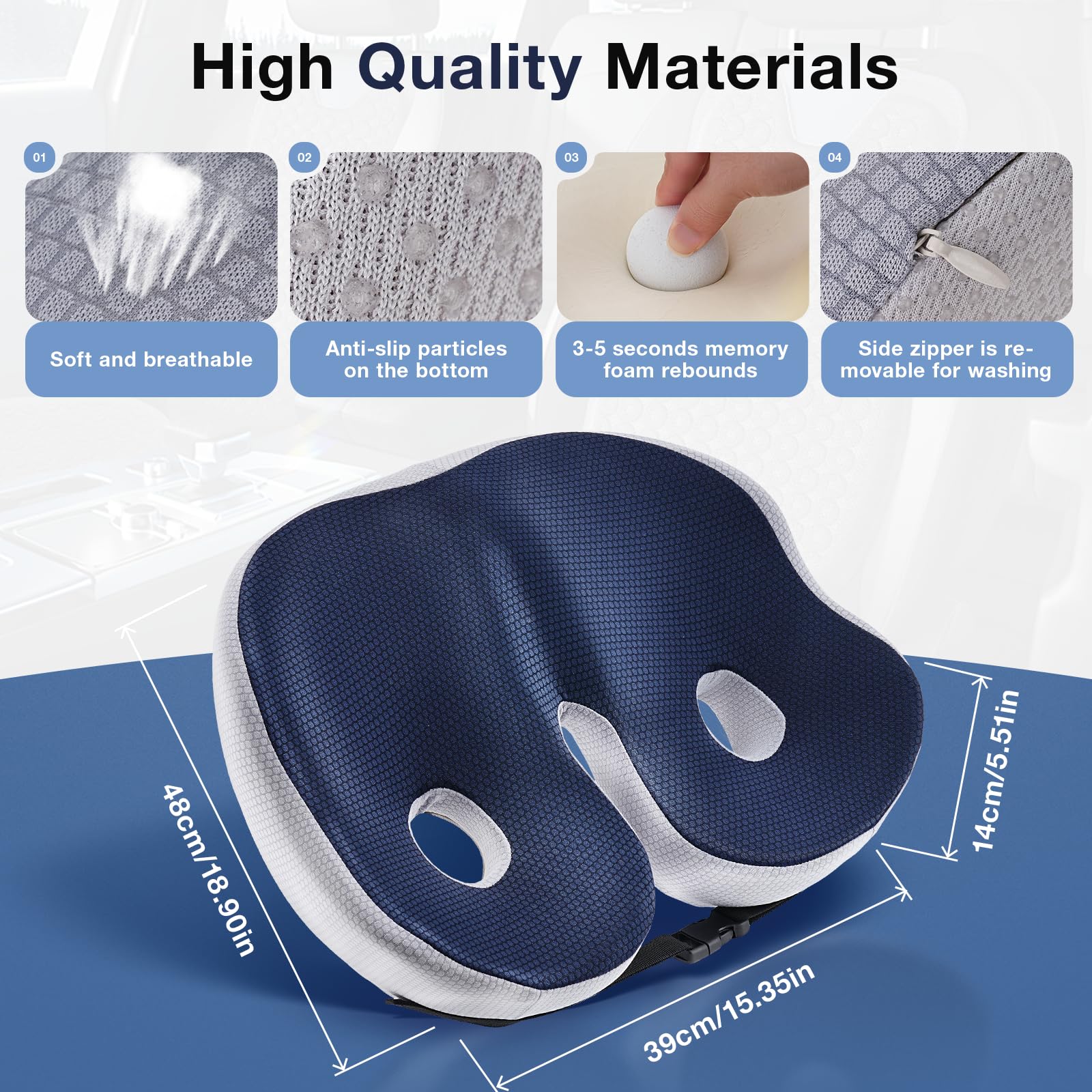 Rückenschmerzen adé! Dieses Autositzkissen mit Memory-Schaum macht langes Sitzen zur Wohlfühl-Experience. Egal ob auf der langen Autofahrt in den Urlaub oder im Büro - die ergonomische Form stützt deinen Lendenbereich perfekt und entlastet das Steißbein. Der hochdichte Schaum passt sich deiner Körperform an und sorgt für optimalen Komfort. Das beste: Die rutschfeste Unterseite hält sicher auf jedem Sitz! Das Deckmaterial aus südkoreanischer Seide ist super atmungsaktiv - kein Schwitzen mehr auch an heißen Tagen. In schickem Schwarz oder Marine passt es zu jedem Auto-Innenraum oder Bürostuhl. Einfach drauflegen und sofort mehr Sitkomfort genießen! Ob für die tägliche Pendelfahrt, die Roadtrip-Tour oder einfach für mehr Komfort im Homeoffice - dieses Kissen ist dein neuer bester Freund. Dein Rücken wird's dir danken! Und falls du mal was anderes brauchst: Passt auch super auf den Gartenstuhl oder die Couch. Einfach universell einsetzbar!