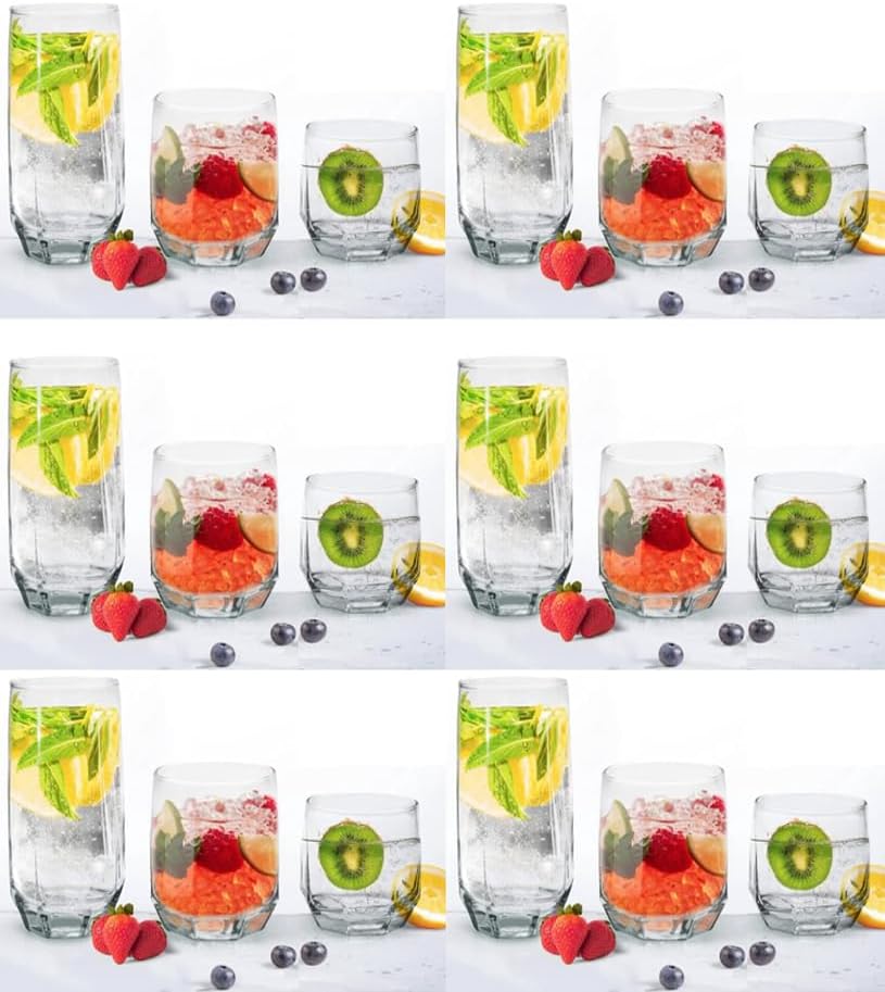 Moin ihr Entertainer! Dieses 18-teilige Gläserset ist einfach alles, was man für gemütliche Abende braucht. Drei verschiedene Größen - jeweils sechs Stück - decken wirklich jeden Durst ab: 385 ml für Longdrinks und Saftschorlen, 310 ml perfekt für Whisky oder Likör, und die kleinen 215 ml für Schnäpse oder Shot-Varianten. Die Gläser stehen bombenfest durch ihren dicken Boden und die abgeschrägten Kanten liegen super in der Hand. Selbst Kinder kriegen die gut zu fassen! Alles spülmaschinengeeignet - kein lästiges Abtrocknen. Ob Wasser, Cocktails, Eiskaffee oder einfach nur was zum Anstoßen - mit diesen Gläsern macht jedes Getränk was her. Zeitloses Design das zu allem passt!