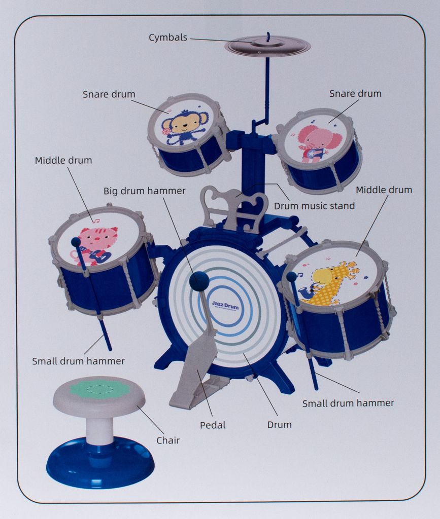 Rockstar gesucht! Dieses komplette Schlagzeug-Set macht dein Kind zum Drummer. Enthält alles: 5 Trommeln, Becken, 2 Stöcke, Hocker, Notenständer und Fußpedal. Aus sicheren Materialien - perfekt für Kinder ab 3 Jahren. Der Hocker trägt bis 50kg - auch für größere Kids geeignet. Einfach montieren - kein Werkzeug nötig! Maße: 67x35x65cm - ideal für Kinderzimmer. Nur 1,5kg schwer - leicht zu bewegen. Die kleineren Trommeln passen in die großen - platzsparend verstaut. Mit Aufbewahrungs-Schlitzen für die Stöcke. Fördert Rhythmusgefühl und Koordination. Super für erste musikalische Erfahrungen! In blau mit süßen Tier-Mustern. Mach deinem Kind eine Freude mit diesem tollen Musik-Set!
