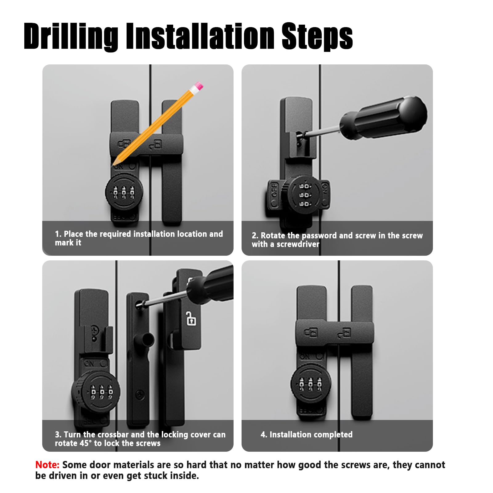 Mehr Sicherheit für dein Zuhause! Dieses praktische Schiebetürschloss mit 3-stelligem Zahlencode schützt Türen, Schränke und Schubladen zuverlässig. Aus robuster Zinklegierung gefertigt, rostfrei und langlebig. Der 180-Grad-Riegel sorgt für sicheren Verschluss. Kein lästiges Schlüssel-Suchen mehr - einfach Code eingeben und öffnen. Zwei Montagearten: mit Kleber oder Schrauben. Das Standardpasswort ist 000, lässt sich aber einfach ändern. Perfekt für Gartenhäuser, Garagen, Badezimmer oder jeden Raum der zusätzlichen Schutz braucht. Einfache Installation in wenigen Minuten!