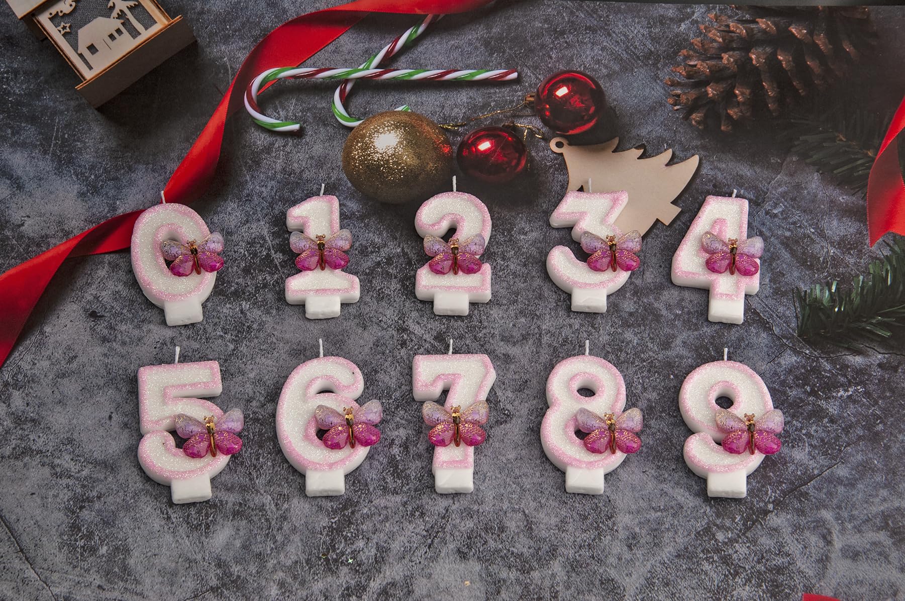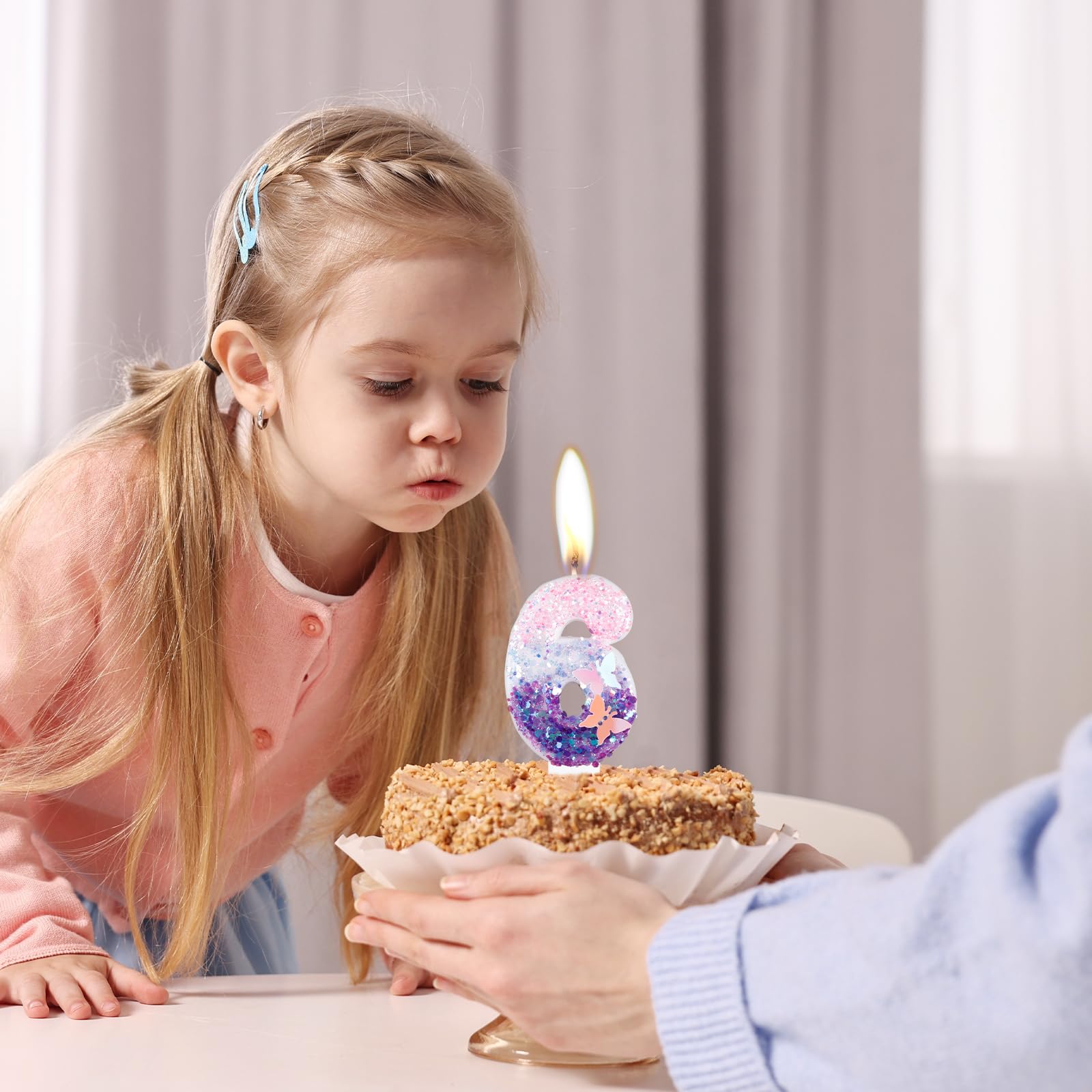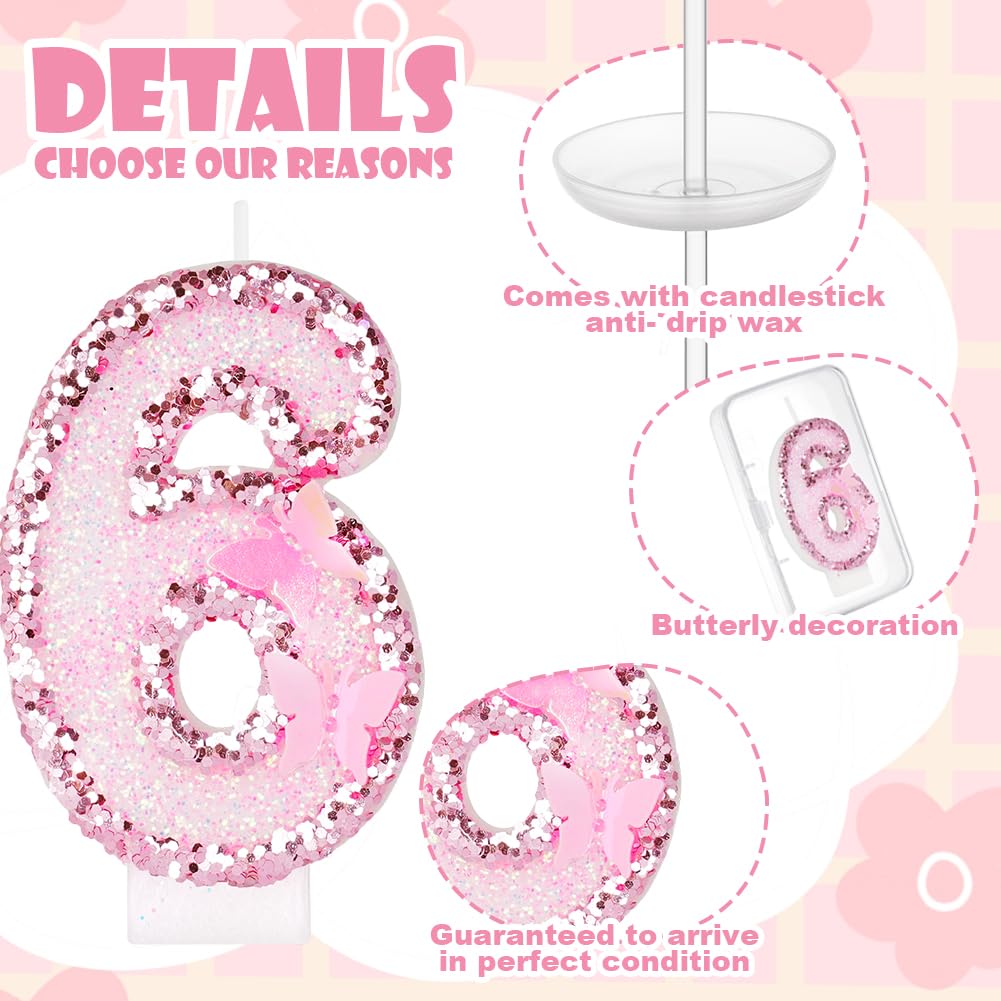 DazzJoy 3D Schmetterling Kerze Zahl 6 - Rosa Glitzerkerze Für Mädchengeburtstag