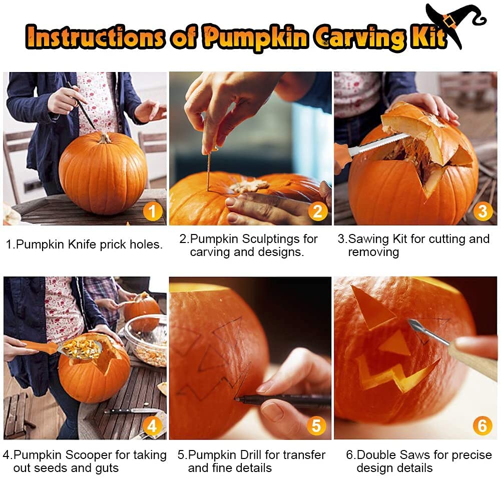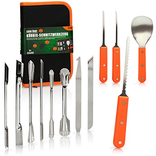 Bereit für gruselige Halloween-Kürbisse? Dieses 13-teilige Profi-Set macht das Schnitzen zum Kinderspiel - im wahrsten Sinne des Wortes!\\n\\n• Aus rostfreiem Edelstahl für scharfe Schnitte\\n• Inklusive 10 Papier-Vorlagen mit lustigen Gesichtern\\n• Mit praktischer Tragetasche für unterwegs\\n• Ergonomische Griffe für ermüdungsfreies Arbeiten\\n\\nEnthalten sind alles was du brauchst: Säge für den Deckel, Spatel zum Aushöhlen, Bohrer für Muster und verschiedene Schnitzwerkzeuge für Details. Perfekt für Familien - unter Aufsicht können auch Kinder mitmachen und ihrer Kreativität freien Lauf lassen. Das Set hilft dir, deine Ideen einfach in beeindruckende Kürbiskunstwerke zu verwandeln. Viel Spaß beim Schnitzen!