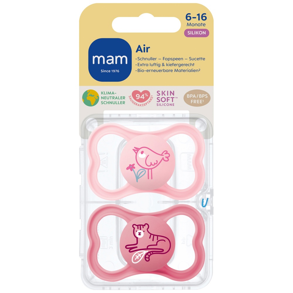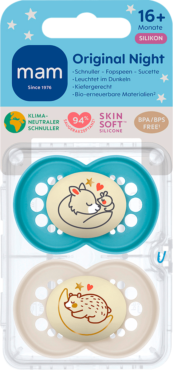 Der Game-Changer für alle Eltern! Diese MAM Night Schnuller leuchten im Dunkeln - so findest du sie nachts blitzschnell. Im 2er-Set in Rosa/Gelb, für Babys ab 6 Monaten. Der kiefergerechte, symmetrische Sauger aus Naturkautschuk ist super weich und bissfest. Die hautfreundliche Maske liegt angenehm an. Mit praktischer Sterilisationsbox - einfach in die Mikrowelle und in 3 Minuten keimfrei. BPA- und BPS-frei, also absolut unbedenklich. Endlich keine nächtliche Schnuller-Suche mehr!
