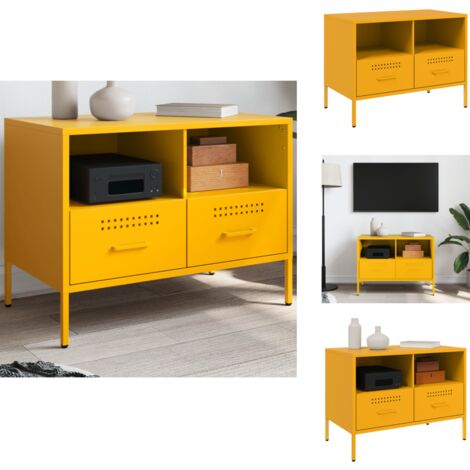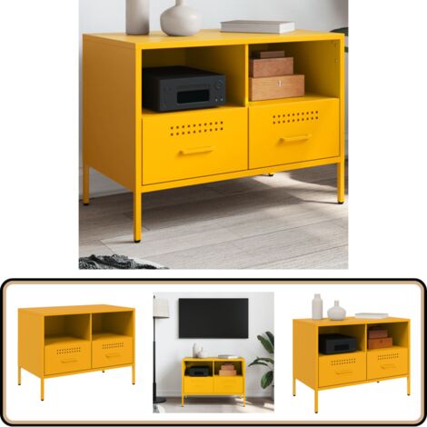Dieses TV-Schrank Set im trendigen Senfgelb bringt Industrie-Chic in dein Wohnzimmer! Aus robustem kaltgewalztem Stahl - extra stabil und langlebig. Mit 68x39x50,5cm bieten die beiden Schränke genug Platz für Bücher, DVDs, Fernbedienungen und mehr. Jedes Teil trägt bis zu 30kg und hat 2 Fächer + 2 Schubladen. Die 4 verstellbaren Füße gleichen unebene Böden aus. Achtung: Zur Sicherheit mit der mitgelieferten Wandhalterung befestigen! Einfach mit feuchtem Tuch reinigen - kaum Pflege nötig. Sieht nicht nur gut aus, sondern ist auch super praktisch. Einfach aufhängen und dein Wohnzimmer ist sofort aufgewertet!