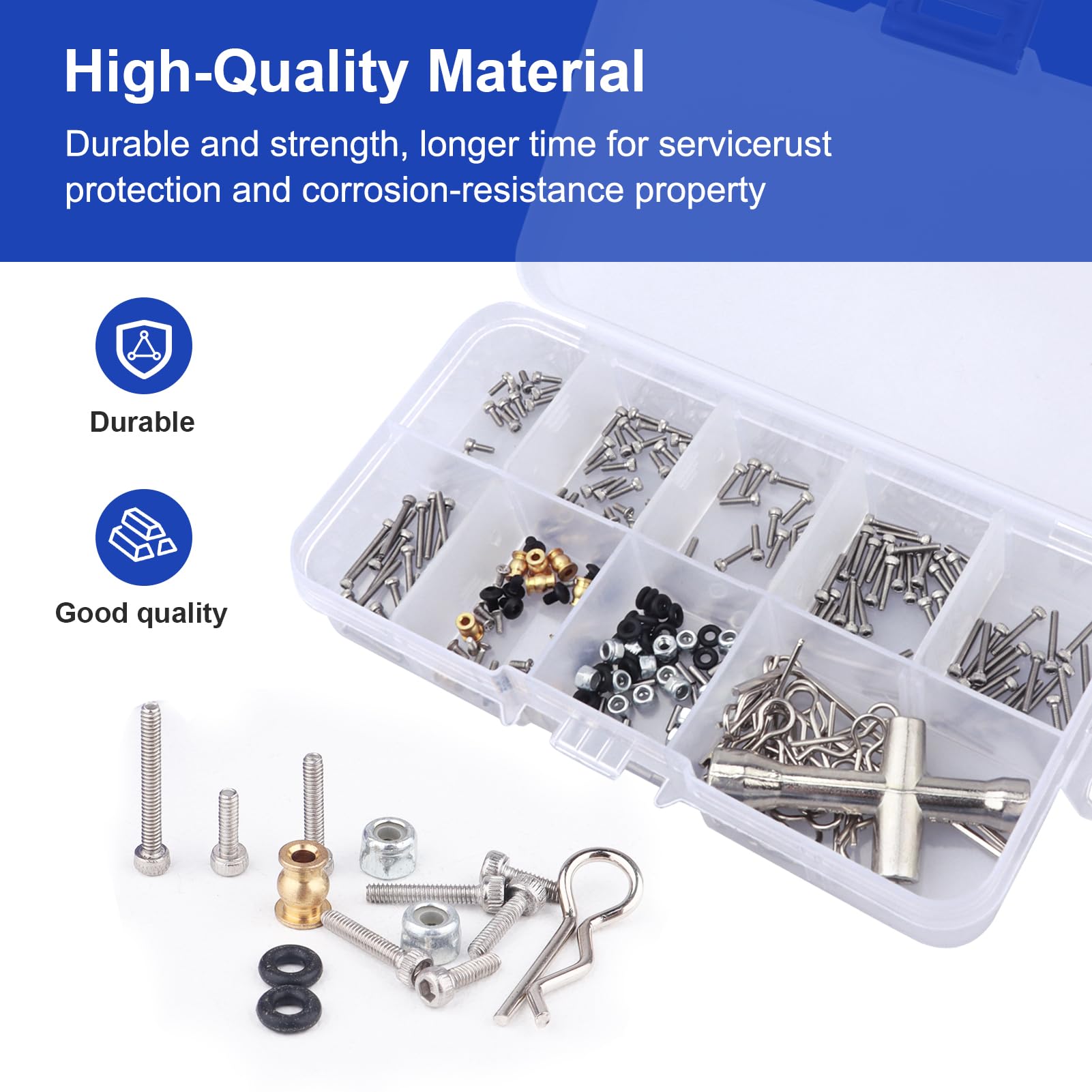 Alles, was dein RC-Crawler braucht! Dieses INJORA Schrauben-Set aus rostfreiem Edelstahl ist perfekt für 1/18 und 1/24 Modelle wie Axial SCX24, Deadbolt, JLU, Gladiator und Bronco. Enthält verschiedene Größen an Schrauben, Muttern, Lagern, O-Ringen und Stiften - alles, was du für Wartung und Upgrades benötigst. Mit zwei praktischen Sechskant-Schraubendrehern wird der Einbau zum Kinderspiel. Die Aufbewahrungsbox hilft dir, Ordnung zu halten und alles griffbereit zu haben. Hochwertige Verarbeitung mit INJORA Logo - Qualität, auf die du dich verlassen kannst. Perfekt für alle, die ihren Micro-Crawler in Schuss halten oder aufmotzen wollen!
