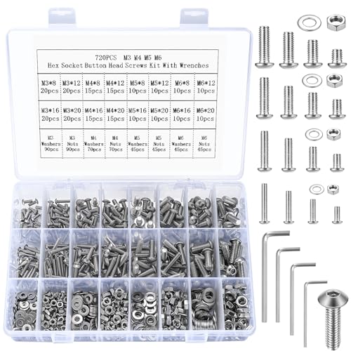 Endlich Ordnung im Schrauben-Chaos! Dieses mega umfangreiche 720-teilige Schrauben-Set hat wirklich alles, was das Heimwerker-Herz begehrt. 🔧\n\nEnthalten sind Schrauben in den Größen M3, M4, M5 und M6 mit Längen von 8mm, 12mm, 16mm und 20mm. Dazu passende Muttern, Unterlegscheiben und sogar die richtigen Sechskantschlüssel - also wirklich komplett!\n\nDie Linsenkopf-Innensechskantschrauben sind aus hochwertigem Kohlenstoffstahl, super stabil und korrosionsbeständig. Die Gewinde sind sauber geschnitten und die Steigung gleichmäßig - da verrutscht nichts so leicht.\n\nPerfekt für: 🏠 Heimwerker-Projekte 🔨 Maschinenbau 💻 Elektronik-Reparaturen 🎯 Modellbau 🛠️ Werkstatt-Arbeiten\n\nOb du was reparieren, zusammenbauen oder kreativ werden willst - mit diesem Set hast du immer die richtige Schraube parat. Nie wieder extra zum Baumarkt fahren müssen!\n\nSuper praktisch: Die Schrauben sind ideal zum Ersetzen von verlorenen oder beschädigten Teilen. Für Profis und Hobbybastler gleichermaßen geeignet - ein echter Allrounder für jede Werkstatt!