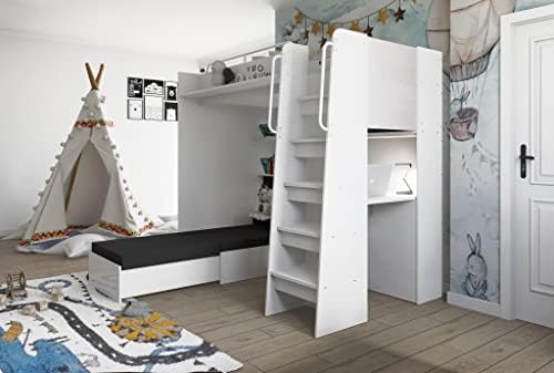 Das ultimative Raumwunder für jedes Kinder- oder Jugendzimmer! Dieses tolle Hochbett kombiniert Schlafplatz, Arbeitsbereich und gemütliche Sitzgelegenheit in einem. Oben eine gemütliche Schlaffläche von 90x200 cm (Matratze nicht inklusive), unten ein praktisches ausklappbares Sofa mit 70x180 cm Liegefläche - perfekt für Übernachtungsgäste. Dazu kommen ein geräumiger Schreibtisch und drei Schränke für jede Menge Stauraum. Die Treppe auf der rechten Seite sorgt für sicheren Auf- und Abstieg. Aus hochwertigen laminierte Spanplatten gefertigt und in schickem Weiß glänzend - ein Möbelstück, das mitwächst und jahrelang Freude bereitet. Einfache Selbstmontage mit bebilderter Anleitung.