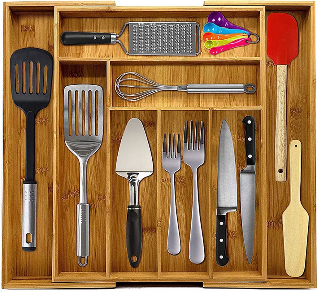 Endlich Ordnung in deiner Schublade! Dieser elegante Bambus-Organizer von ROYAL CRAFT WOOD bringt System in deine Küche. Mit 9 praktischen Fächern hast du alles perfekt sortiert - Besteck, Küchenutensilien, aber auch Büroartikel oder Schmuck. Aus nachhaltigem Bambus gefertigt, ist der Organizer nicht nur umweltfreundlich, sondern auch super stabil. Die gerillten Trennwände sorgen für festen Halt aller Gegenstände. Einfach in die Schublade legen und sofort ist alles griffbereit. Die Reinigung ist ein Kinderspiel - einfach mit einem feuchten Tuch abwischen. Schwarz matt sieht er zudem richtig edel aus und passt zu jedem Einrichtungsstil.