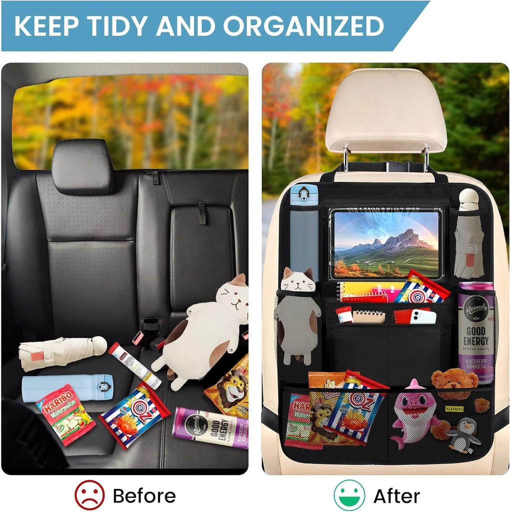Schluss mit dreckigen Autositzen! Dieses 2-teilige Set schützt sowohl Rückenlehnen als auch Sitze vor Schmutz, Kratzern und Verschleiß. Aus robustem 600D Oxford-Material - super wasserdicht und leicht zu reinigen. Mit praktischen Taschen für Snacks, Spielzeug und Tablet. Einfach mit den Gurten befestigen, passt für die meisten Autos mit 2-Stangen-Kopfstützen. Maße 61x41cm - ideal für Limousinen, SUVs und Familienwagen. Spart teure Reinigungskosten und hält dein Auto immer ordentlich. Der perfekte Begleiter für Familien mit Kindern!