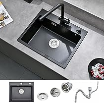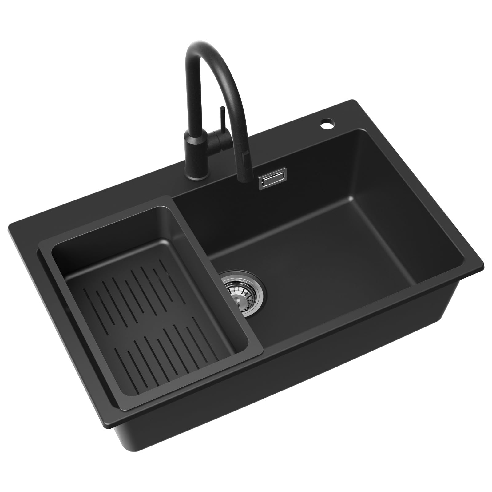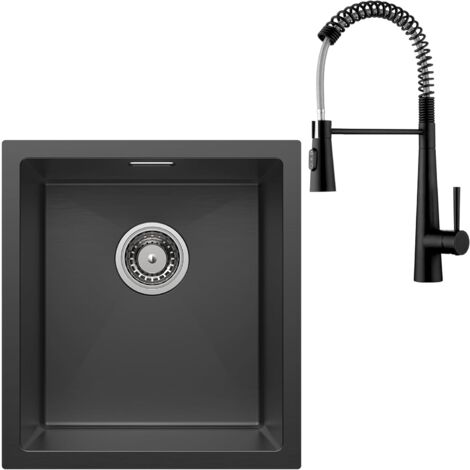 CECIPA Granitspüle Schwarz 70x45cm - Mit Ausziehbarem Wasserhahn & Seifenspender Für Küchen