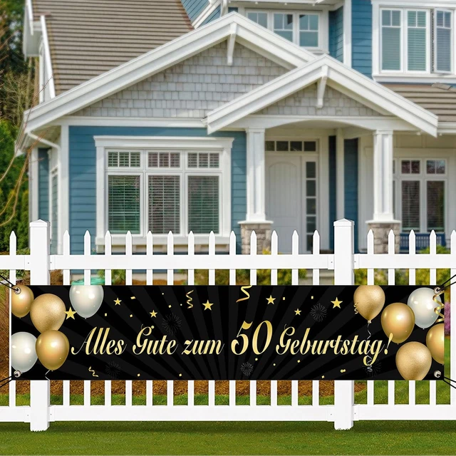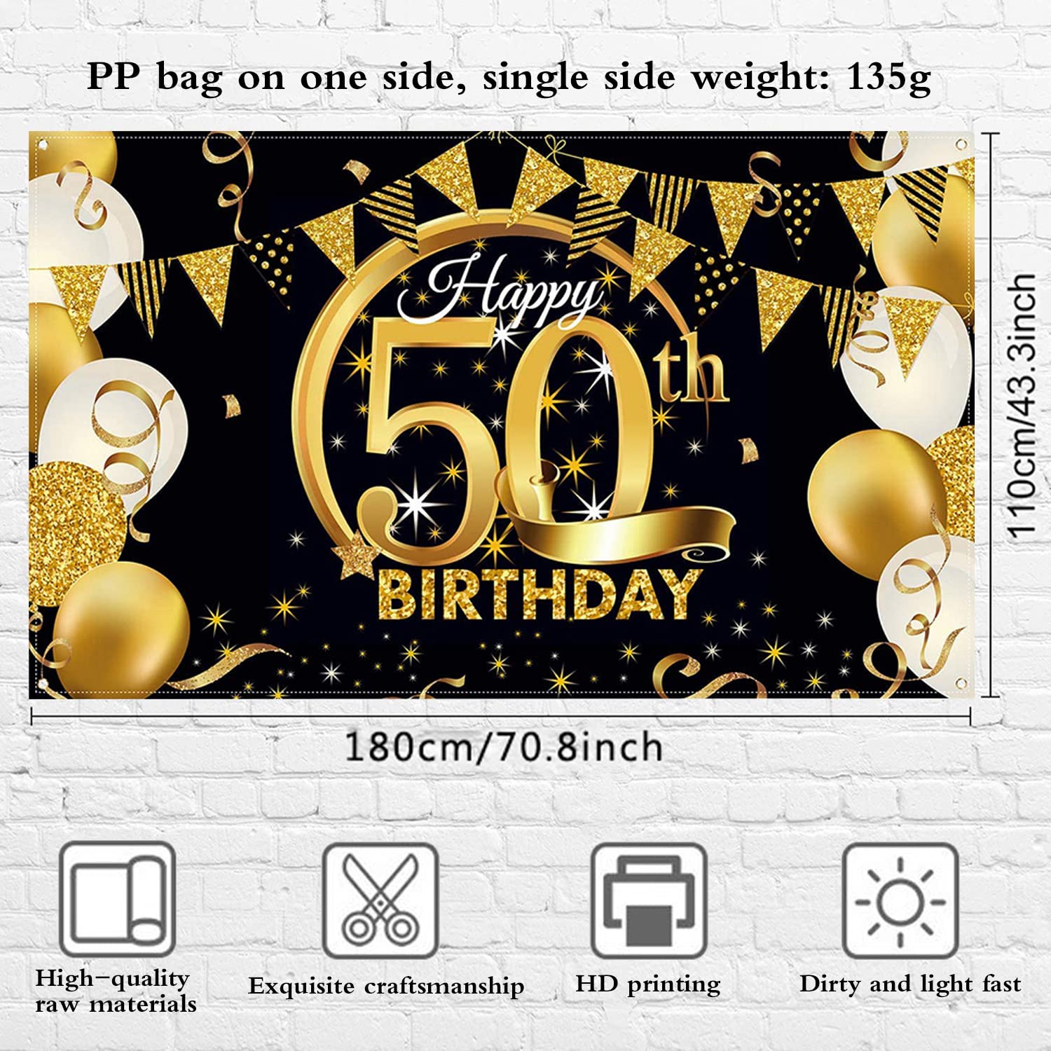 Der Aufdruck 'Happy 50th Birthday' ist gut lesbar und die schwarz-goldene Farbkombination verleiht deiner Feier einen eleganten Touch. Ob im Partyraum, im Garten oder im Wohnzimmer - dieses Banner setzt die perfekte Kulisse für unvergessliche Fotos und eine tolle Atmosphäre!