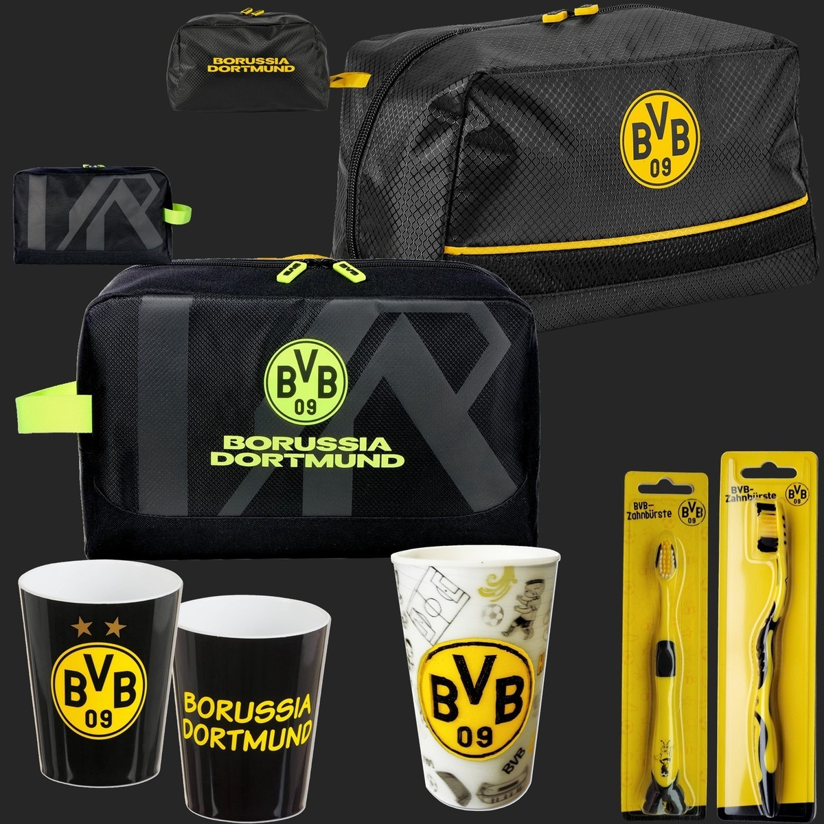 Echte Liebe - zeig deine BVB-Leidenschaft mit diesem kultigen Kulturbeutel! In den Vereinsfarben Schwarz mit Neon-Gelb - da erkennt jeder sofort, wo dein Herz schlägt! Maße 33x18x12 cm - perfekt für alle Reise-Utensilien! Aus robustem 100% Polyester - hält was aus und wiegt nur 110 Gramm! Mit praktischem Reißverschluss und coolen neon-gelben Ziehern - einfach zu öffnen und zu schließen! Sportliches geometrisches Muster auf der Vorderseite - sieht einfach klasse aus! Neongelber Tragegriff für bequemen Transport - ob im Fitnessstudio, auf Reisen oder im Schwimmbad! Offizielles BVB-Design mit Vereinslogo - nur das Beste für echte Fans! Perfekt für Zahnpasta, Rasierer, Duschgel und all den anderen Kram, den man so braucht! Macht auch als Geschenk für BVB-Fans eine super Figur! Einfach unverzichtbar für jeden Schwarz-Gelb-Begeisterten!
