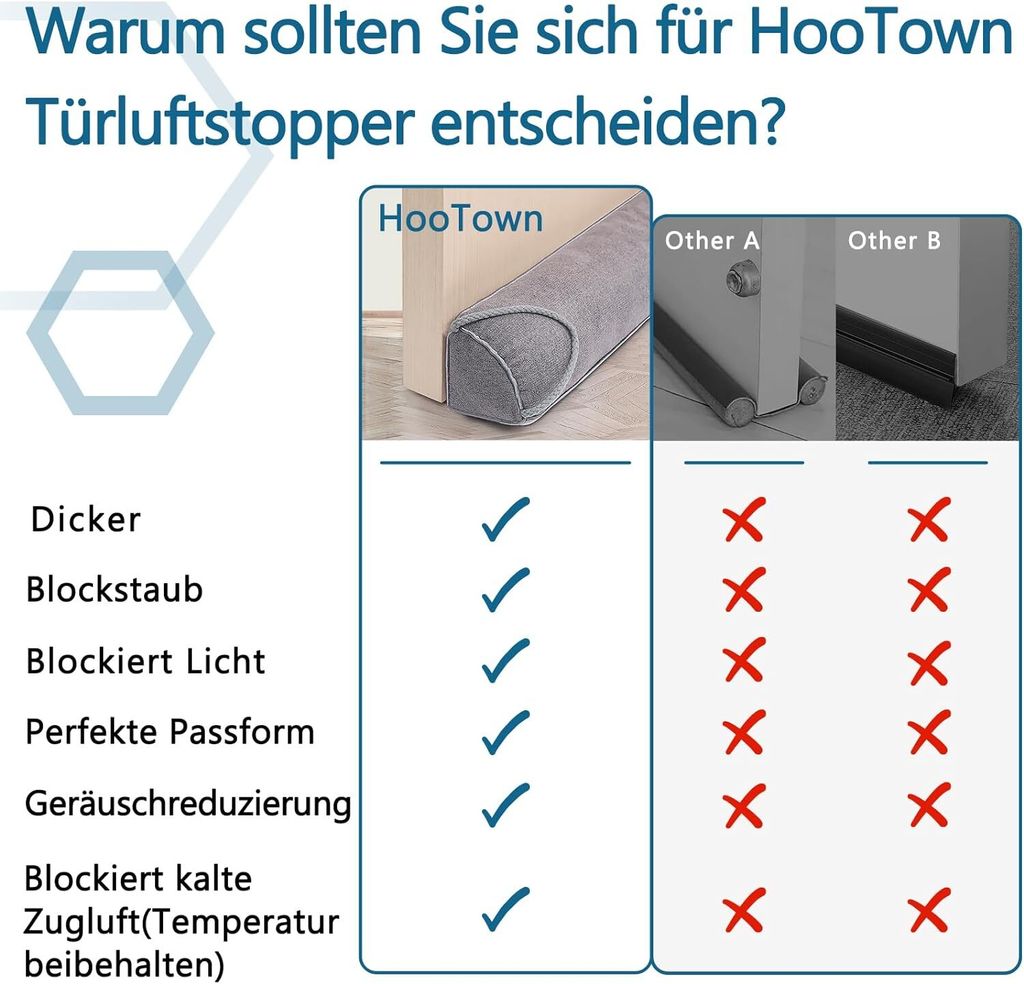 Neben Kälte hält der Stopper auch Lärm, Gerüche und Staub fern. Die Hülle aus Baumwoll-Polyester-Mischung ist haustierfreundlich und kratzt keine Böden. Installation in Sekunden: Einfach das beiliegende Hakenband an der Tür anbringen, den Stopper einklicken - fertig!