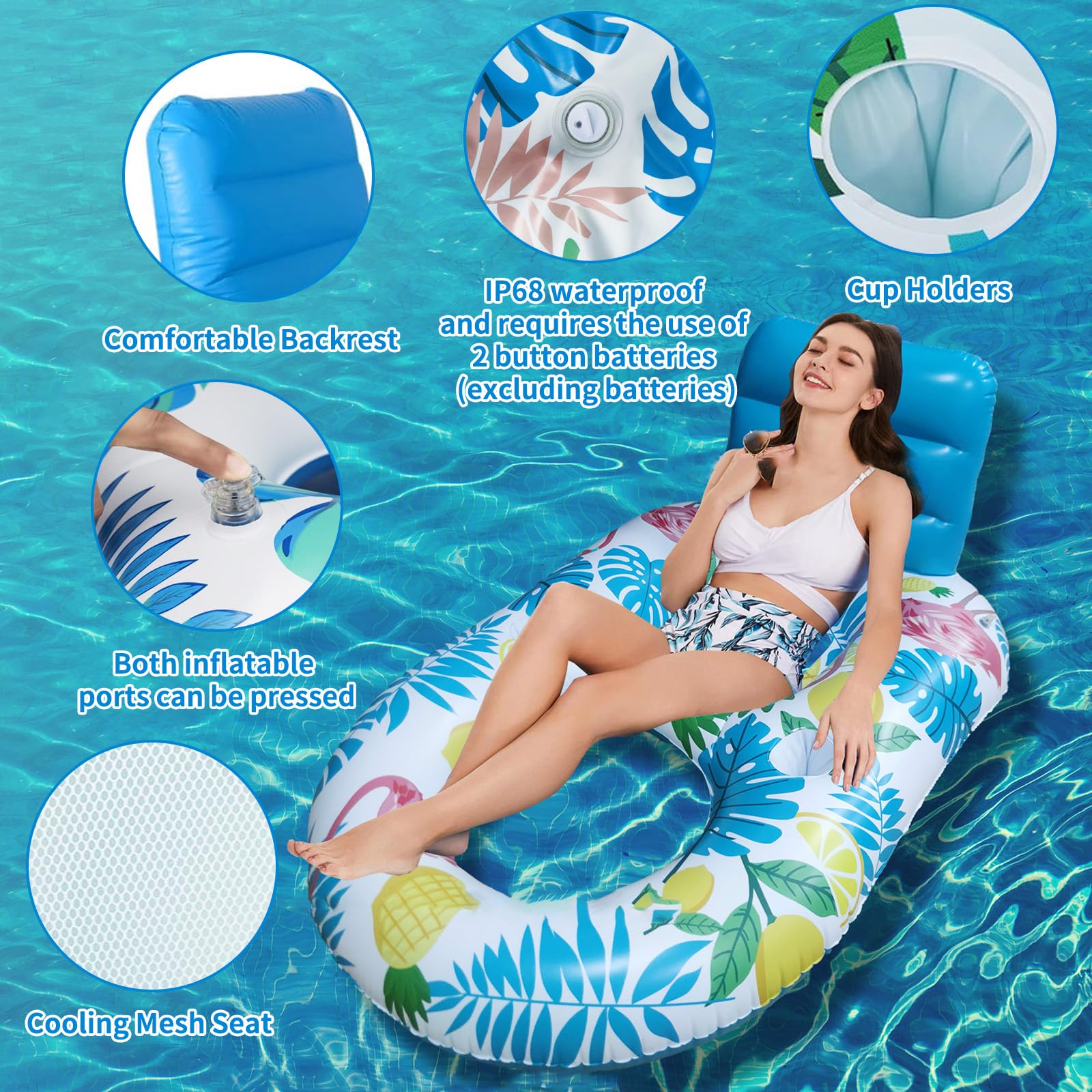 Sommer, Sonne, Pool-Time! Dieser aufblasbare Poolsessel in U-Form ist dein perfekter Begleiter für entspannte Stunden im Wasser. Mit 103x80 cm Größe und für 47-80kg geeignet, bietet er maximalen Komfort. Das Highlight: Der abnehmbare doppellagige Sonnenschutz mit LSF 50 blockiert UV-Strahlen effektiv, lässt aber Luft durch. Integrierte Getränkehalter und Staufächer an den Seiten sorgen dafür, dass deine Sachen immer griffbereit sind. Die dreifach stabile Struktur mit verbreiterter Basis und einteiligen Armlehnen minimiert die Umkippgefahr. Das U-förmige Sitzdesign lässt Arme und Beine bequem im Wasser baumeln, während die ergonomische Rückenlehne für optimalen Komfort sorgt. Perfekt für Pool, See oder Meer - einfach aufblasen und den Sommer genießen! Aus robustem PVC, einfach zu reinigen und platzsparend zu verstauen.