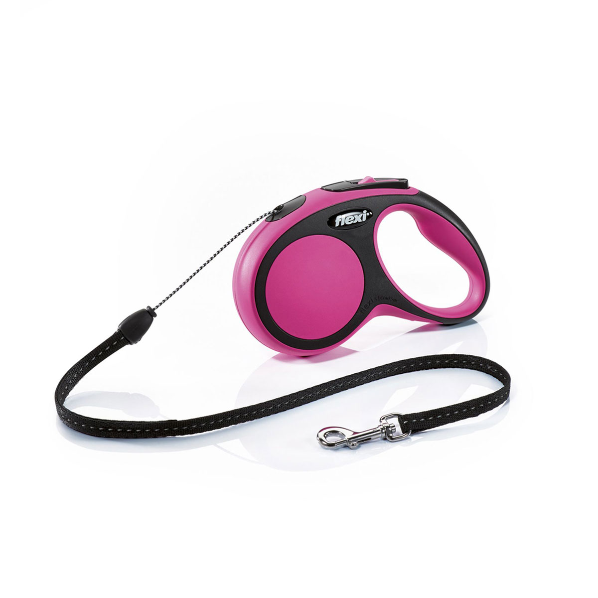 Dein Hund will laufen, du willst Kontrolle? Mit der flexi New Comfort Seil-Leine habt ihr beide das Beste! Die 8 Meter lange Leine in Pink/Schwarz gibt deinem kleinen Hund (bis 12kg) jede Menge Bewegungsfreiheit, während du dank des innovativen Kurzhub-Bremssystems immer die Kontrolle behältst.\\n\\nDer ergonomische Soft-Griff liegt super angenehm in der Hand und lässt sich sogar in der Größe verstellen - kein Verkrampfen mehr bei langen Spaziergängen! Die bewährte flexi Technik Made in Germany sorgt für ein sanftes Ein- und Auslaufen des Seils ohne lästiges Durchhängen.\\n\\nBesonders praktisch: Die integrierte Dauerstopptaste für die Fuß-Arbeit und die Möglichkeit, die Leine mit dem LED Lighting System für mehr Sicherheit im Dunkeln oder der Multi Box für Leckerlis und Kotbeutel zu erweitern.\\n\\nDas zweifarbige Design sieht nicht nur stylisch aus, sondern ist auch super funktional. Seit 1973 steht flexi für Qualität und Innovation - über 200 Millionen verkaufte Roll-Leinen sprechen für sich!\\n\\nOb für den Stadtspaziergang oder den Ausflug ins Grüne - mit dieser Leine wird jeder Gassigang zum entspannten Erlebnis für dich und deinen Vierbeiner!