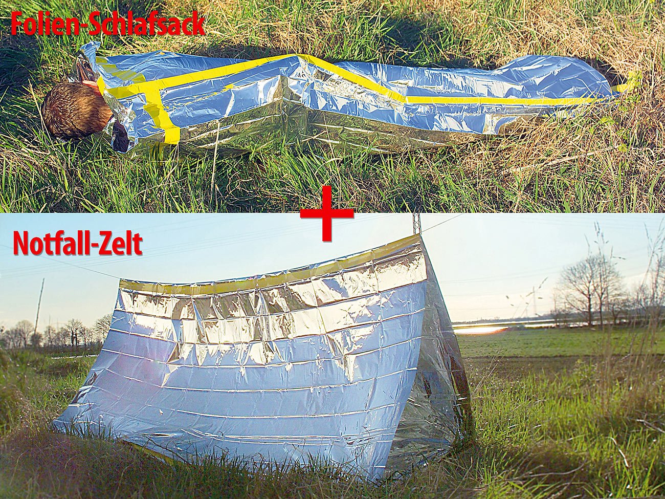 Für alle Outdoor-Fans! Dieses Survival-Set könnte im Ernstfall lebenswichtig sein. Enthält ein Notfall-Zelt für 2 Personen (ca. 240 cm lang) UND einen Folien-Schlafsack (210x90 cm). Super leicht - nur 200 Gramm - und winzig klein zusammengefaltet (23x17 cm). Perfekt für Wanderungen, Bergtouren oder einfach fürs Auto. Schützt zuverlässig vor Kälte, Wind und Nässe. Die Rettungsdecke ist extrem reißfest und kann auch für den Transport von Verletzten verwendet werden. Inklusive Schnur zum Aufhängen oder Befestigen. Einfach in den Rucksack werfen und im Notfall sofort einsatzbereit. Ob bei plötzlichem Unwetter oder ungeplanter Übernachtung im Freien - mit diesem Set bist du immer auf der sicheren Seite!