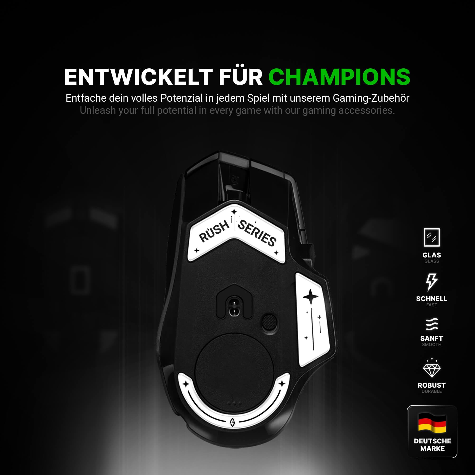 Aus hochwertigem PTFE (Teflon) gefertigt, sorgen sie für ultraschnelles, reibungsarmes Gleiten. Die abgerundeten Kanten garantieren flüssige Bewegungen ohne Verzögerung - genau das, was du in hitzigen Gaming-Matches brauchst.
