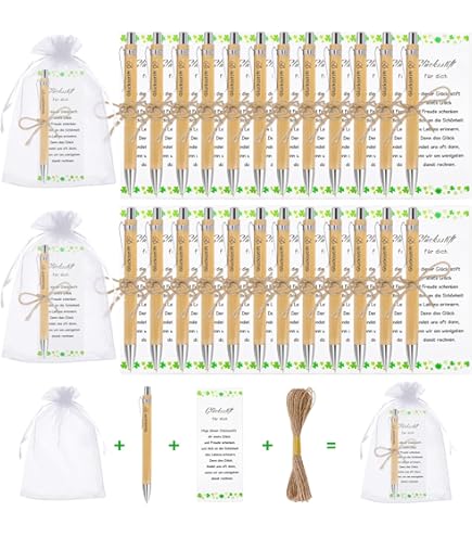 Wow, dieses Glücksstift-Set von Otuuz ist einfach perfekt für alle, die jemandem eine Freude machen wollen! Enthalten sind 12 Holzkugelschreiber mit der Aufschrift 'Glücksstift', 12 wunderschöne Dankeskarten mit Regenbogen-Kleeblatt-Motiv, 12 süße Kleeblatt-Schlüsselanhänger mit 'Du schaffst das'-Aufdruck, Organzabeutel und sogar 10 Meter Hanfseil zum Verpacken! Jedes Teil ist liebevoll designed und symbolisiert Glück, Liebe und Hoffnung. Super für Kollegen, die eine Prüfung bestehen müssen, für Freunde in schwierigen Zeiten oder einfach als nette Aufmerksamkeit im Team. Die Kugelschreiber schreiben super und die Karten sind aus hochwertigem 300g-Papier. Einfach alles zusammenpacken, verschenken und strahlende Gesichter erleben! Ob zum Geburtstag, zu Weihnachten oder einfach mal so - dieses Set bringt garantiert Glück und Motivation! Mach anderen eine Freude und verschenke ein Lächeln!