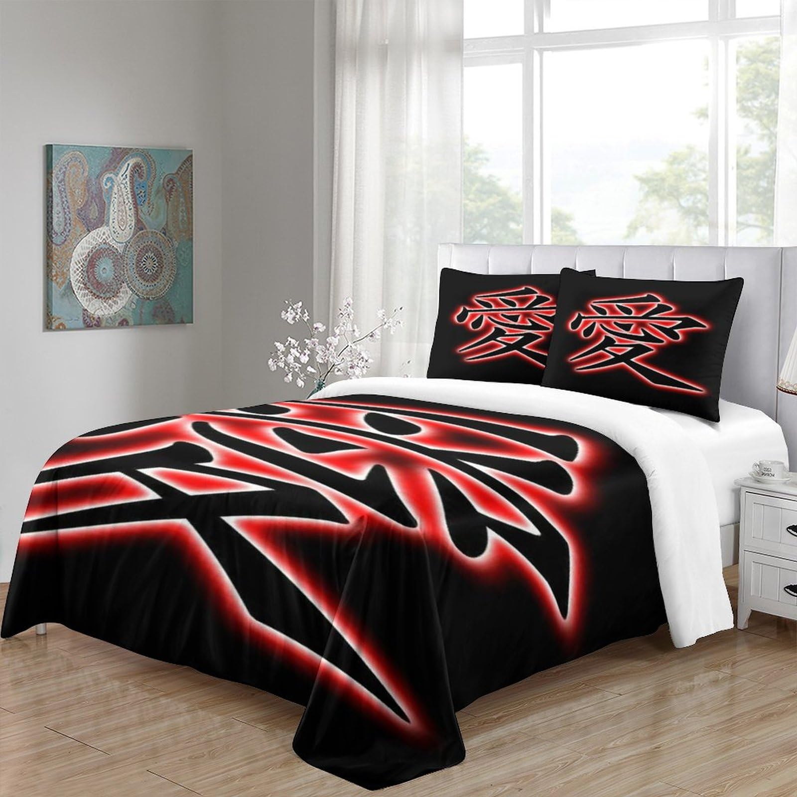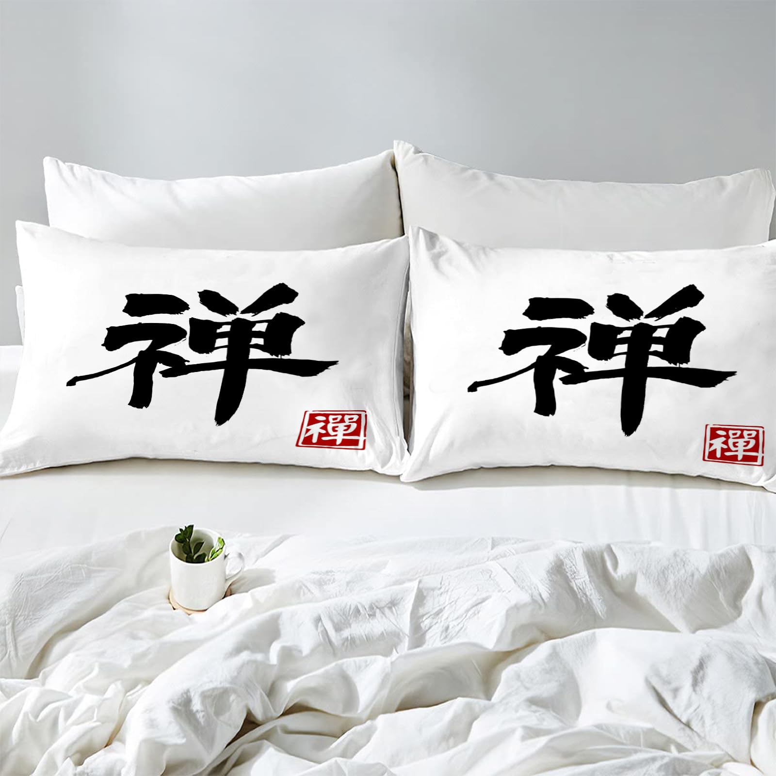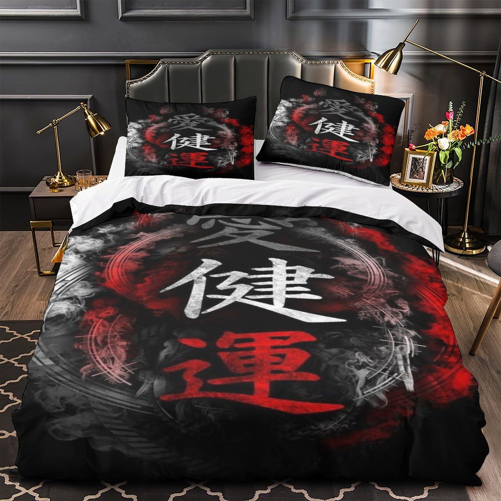 Bettwäsche Set 155x220 Schwarz Mit Chinesischen Schriftzeichen - 3-teilig Microfaser Wendebettwäsche
