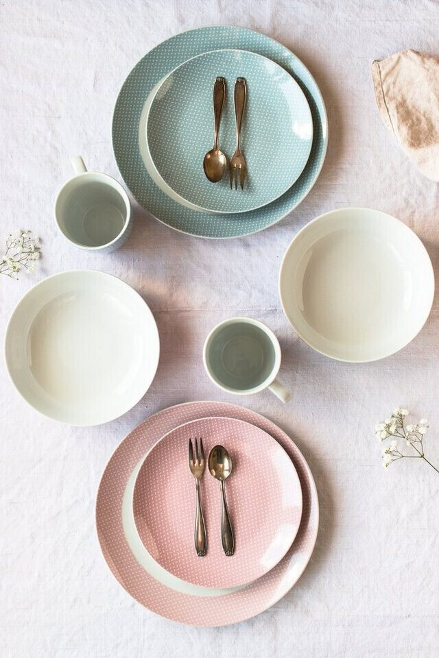 Bring frischen Wind in deine Küche mit diesem hübschen Geschirr-Set von MÄSER! Das 16-teilige Service für 4 Personen kommt in dezenten Pastellfarben mit modernem Muster. Enthalten sind: 4 flache Teller (27 cm), 4 Mehrzweckschalen für Suppe oder Müsli (780 ml), 4 Dessertteller (20,5 cm) und 4 großzügige Kaffeebecher (400 ml). Aus hochwertigem Porzellan gefertigt - robust, spülmaschinenfest und mikrowellengeeignet. Die österreichische Traditionsmarke steht für Qualität und Langlebigkeit. Besonders praktisch: Die Mehrzweckschale ersetzt sowohl Suppenteller als auch Müslischale. Die Becher kommen ohne Untertasse aus und haben Platz für deinen Lieblings-Milchschaum. Perfekt für den täglichen Gebrauch, aber auch schick genug für besondere Anlässe. Einfach schön, jedes Mal wenn du den Tisch deckst!