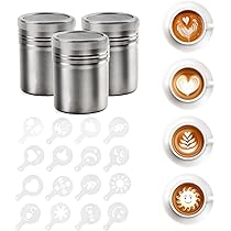 Moin! Dieses AIFUDA Set ist ein echter Alleskönner für alle Kaffee-Liebhaber und Hobby-Köche. Die zwei Edelstahl-Streudosen haben unterschiedliche Siebe: eins mit feinem Netz für feines Pulver wie Zimt oder Kakao, und eins mit Lochgitter für gröbere Gewürze. \\n\\nDas besondere Highlight sind die 16 verschiedenen Schablonen! Damit kannst du deinem Cappuccino oder Latte Macchiauto coole Designs verpassen - ob Herzen, Blätter oder andere Muster. Einfach die Schablone auf die Tasse legen und durchsieben, schon hast du nen professionell aussehenden Kaffee! \\n\\nDie Dosen sind aus 304er Edelstahl - also absolut lebensmittelecht und spülmaschinenfest. Die versiegelten Deckel halten die Feuchtigkeit raus, damit deine Gewürze und Pulver schön frisch bleiben. Die Größen sind praktisch gewählt: 8x5,9cm fürs feine Sieb und 8x6,5cm fürs Lochgitter. \\n\\nOb in der Küche, beim Backen oder für die Kaffee-Bar - dieses Set macht einfach Spaß! Die Reinigung ist ein Kinderspiel und der mitgelieferte Organisationsring hält die Schablonen ordentlich beisammen. Perfekt für alle, die ihr Essen und ihre Getränke optisch aufwerten wollen!